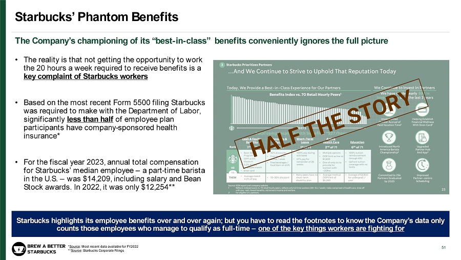 •现实情况是,没有机会获得领取福利所需的每周20小时的工作时间是星巴克员工的一个关键抱怨•根据星巴克被要求向劳工部提交的最新5500表格文件,明显少于一半的员工计划参与者拥有公司赞助的健康保险* •在2023财年,星巴克的中位员工——美国的兼职咖啡师——的年度总薪酬为14,209美元,包括工资和Bean Stock奖励。2022年仅为12254美元* *公司对“同类最佳”福利的拥护方便地忽略了全貌51星巴克一遍又一遍地强调其员工福利;但你必须阅读脚注才能知道公司关于ly统计那些设法获得全职资格的员工的数据——这是员工为星巴克的虚拟福利而战的关键因素之一*资料来源:2022财年可获得的最新数据* *资料来源:星巴克公司文件