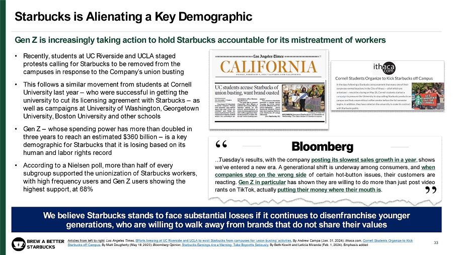 Z世代越来越多地采取行动,要求星巴克对其虐待员工的行为负责33我们认为,如果星巴克继续剥夺年轻一代的权利,他们将面临巨大损失,他们愿意离开与他们的价值观不同的品牌,星巴克正在疏远一个关键的人口统计Z……周二的结果,该公司发布了一年来最慢的销售增长,这表明我们已经进入了一个新时代。消费者之间正在发生代际转换,当企业在某些热键问题上踩错了一边时,他们的客户就会做出反应。特别是Z世代已经表明,他们愿意做的不仅仅是在TikTok上发布视频咆哮,实际上是把钱放在嘴边。“”文章从左至右:洛杉矶时报,加州大学河滨分校和加州大学洛杉矶分校酝酿将星巴克赶出校园进行‘工会破坏’活动的努力,作者:Andrew Campa(2024年1月31日);Ithaca.com,康奈尔大学学生组织将星巴克踢出校园,作者:Matt Dougherty(2023年5月18日);彭博观点,星巴克的收益是一个警告:认真对待抵制,作者:Beth Kowitt和Leticia Miranda(2024年2月1日)。强调补充•最近,加州大学河滨分校和加州大学洛杉矶分校的学生举行抗议活动,呼吁将星巴克从校园中移除,以应对该公司的工会破坏•在此之前,去年康奈尔大学的学生也采取了类似的行动——他们成功地让该大学削减了与星巴克的许可协议——以及华盛顿大学乔治城大学的活动,波士顿大学和其他学校• Z世代——其消费能力在三年内翻了一倍多,估计达到3600亿美元——是星巴克的一个关键人群,根据其人权和劳工权利记录,它正在失去•根据尼尔森的一项民意调查,每个子群体中都有超过一半的人支持星巴克员工加入工会,高频用户和Z世代用户的支持率最高,为68%