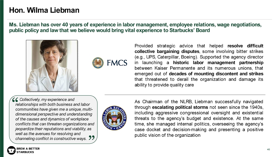 •星巴克有缺陷的人力资本管理战略是该公司今天面临的最关键问题•星巴克对其员工加入工会运动的回应一直是咄咄逼人的反对,在许多情况下违反了美国劳动法。据估计,该公司在这些努力上花费了近25亿美元* ——与此同时,不断的媒体、政策制定者和监管机构的审查严重损害了品牌价值•问题正在变得更糟,而不是更好——星巴克员工发起的运动是美国历史上增长最快的基层劳工运动,* *与劳工相关的投诉/案例数量已达到难以控制的水平,消费者对该公司的意见急剧下降•董事会(“董事会”)容忍了令人无法接受的声誉风险,赞同对劳资问题采取适得其反的做法,并允许有缺陷的资源分配——所有这些都会对股东价值产生负面影响•在我们的竞选活动开始后,董事会就其修复与员工关系的承诺发表了无数被动声明——但其行动与其言辞不符•自星巴克于2021年12月开始错误处理工会问题以来,股东总回报(“TSR”)的表现明显逊于同行,利润率已经缩水,每家门店的员工数量更少,员工的参与度更高• SOC的三名董事候选人拥有目前董事会所缺乏的专业知识,包括:•管理工会企业的经验•与工会成功合作——并整合——工会的经验•在与监管机构进行建设性合作的同时,在劳动法和政策的关键领域拥有经验•被提名人带来了来自商业、政府和非营利部门的多样化领导经验•股东需要SOC的董事会提名人,紧急5为什么现在星巴克需要改变加强董事会监督失败的代价该公司已经失去了2482项违反联邦劳动法的指控Maria Echaveste •公司董事会经验•劳工部高级官员•政府领导层Hon. Joshua Gotbaum •高级管理经验•公司董事会经验•与工会进行谈判以及为工会进行谈判Hon. Wilma Liebman •前NLRB主席•高级劳资纠纷调解员•全球劳工专家•非营利董事会经验*资料来源:SOC根据星巴克公司文件估算,NLRB数据,NLRB总法律顾问投诉和行政法法官裁决* *来源:SOC研究分析~美国82%的门店在提供选择时投票支持加入工会52%的股东支持对工人权利实践TSR进行独立评估,因为自工会化努力开始以来,66%的星巴克顾客不太可能去星巴克,如果公司违反联邦劳动法,SBUX同业基准指数中值(TERM500 Restaurant)(8.0)%(6.0)%(4.0)%(2.0)% 0.0% 2.0% 4.0% 6.0% 8.0% 10.0% 12.0%(6.0)% 10.6% 5.2%来源:彭博TSR评估自2021年12月9日至2023年11月21日,同行队列包括CMG,DRI、MCD、QSR和百胜餐饮