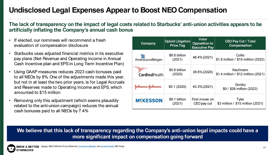 •如果当选,我们的被提名人将建议对薪酬披露进行新的评估•星巴克在其高管薪酬计划中使用调整后的财务指标(年度现金激励计划中的净收入和营业收入以及长期激励计划中的每股收益)•使用GAAP措施将支付给所有NEO的2023年现金奖金减少8%。今年做出的调整之一,但至少在前两年没有,是对营业收入和EPS进行的法定应计和准备金,金额达1500万美元•仅删除这一调整(似乎似乎与反工会运动有关)将支付给所有NEO的年度现金奖金减少7.4%与星巴克反工会活动相关的法律费用影响缺乏透明度似乎是在人为地夸大公司的年度现金奖金61我们认为认为公司反工会法律影响方面的这种缺乏透明度可能会对未来的薪酬产生更显着的影响未披露的法律费用似乎会推动NEO薪酬CEO减薪/总薪酬选民反对高管薪酬阿片类药物诉讼价格标签公司Collis 180万美元/1500万美元(2022年)48.4%(2021年)66亿美元(2021年)Kaufmann 140万美元/1200万美元(2021年)38.6%(2020年)56亿美元(2020年)Gorsky 0美元/2600万美元(2022年)43.3%(2021年)5.1美元(2020年)Tyler 300万美元/1500万美元(2021年)CEO减薪81亿美元的先行者(2021年)来源:SBUX最终委托书、AmerisourceBergen和卡地纳健康提交给SEC的文件