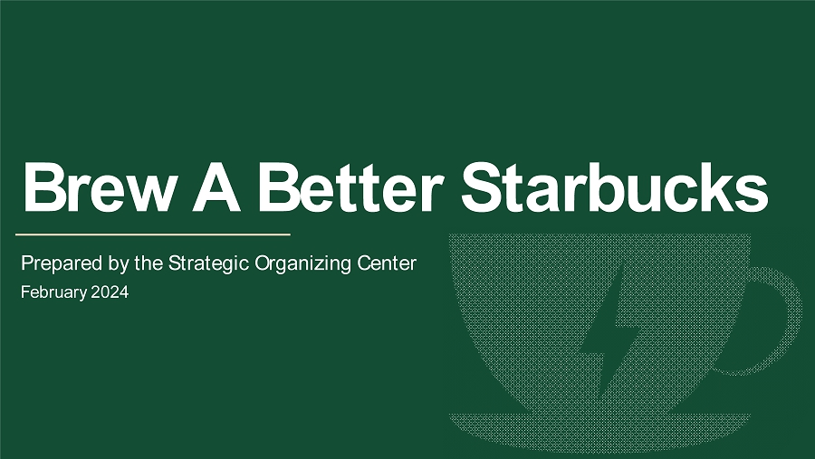 华盛顿– 2024年2月20日– 星巴克公司(纳斯达克:SBUX)(“星巴克”或“公司”)的股东战略组织中心(“SOC”)今天宣布发布一份投资者介绍,详细说明该公司迫切需要进行变革。该演示文稿——题为“酿造更好的星巴克”——可在www.brewABetterStarbucks.com上查阅。