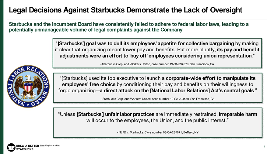 针对星巴克的法律裁决表明缺乏监督9星巴克和现任董事会一直未能遵守联邦劳动法,导致针对该公司的法律投诉数量可能难以控制“[星巴克]的目标是通过明确表示组织意味着更低的工资和福利来降低其员工的集体谈判胃口。更直白地说,它的薪酬和福利调整是为了‘收买’考虑工会代表的员工。”-星巴克公司和工人联合会,案件编号19-加利福尼亚州-294579,加利福尼亚州,旧金山“[星巴克]利用其最高执行官在全公司范围内发起一项努力,通过将员工的薪酬和福利以他们放弃组织的意愿为条件来操纵他们的自由选择——这是对[国家劳动关系]法案中心目标的直接攻击。”-Starbucks Corp. and Workers United,case number 19-加利福尼亚州-294579,San Francisco,加利福尼亚州“除非[星巴克的]不公平劳工做法立即受到限制,否则将对员工、工会和公共利益造成无法弥补的伤害。”-NLRB诉星巴克,案件编号03-加利福尼亚州-285671,纽约州布法罗注:添加了重点