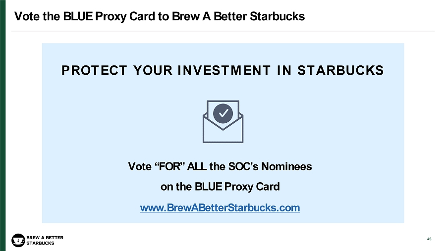 投票支持BLUE代理卡酝酿更好的星巴克46在BLUE代理卡上投票“支持”所有SOC的提名者www.brewABetterStarbucks.com保护你对星巴克的投资