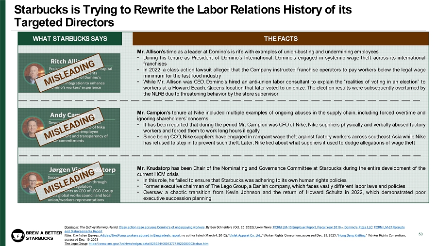 星巴克所说的事实星巴克正试图改写其目标董事的劳资关系历史53艾利森先生在达美乐担任领导期间充斥着工会破坏和损害员工的例子•在他担任达美乐国际总裁期间,达美乐在其国际特许经营范围内从事系统性工资盗窃• 2022年,一项集体诉讼指控该公司指示特许经营经营者向工人支付低于快餐业法定最低工资的工资•艾利森先生担任首席执行官期间,达美乐公司聘请了一名反工会劳工顾问,向皇后区霍华德海滩一处地点的工人解释“在选举中投票的现实”,该地点后来投票成立了工会。选举结果随后被NLRB推翻,原因是门店主管坎皮恩先生在耐克任职期间的威胁行为包括多个供应链中持续存在的滥用行为的例子,包括强迫加班和无视股东的担忧•有报道称,坎皮恩先生在担任耐克首席财务官期间,耐克供应商对工厂工人进行身体和言语上的辱骂,并强迫他们非法长时间工作•自担任首席运营官以来,耐克供应商对东南亚各地的工厂工人进行了猖獗的工资盗窃,而耐克拒绝介入以防止此类盗窃。后来,耐克谎称曾使用哪些供应商来躲避工资被盗的指控。在当前HCM危机的整个发展过程中,克努斯托普先生一直担任星巴克提名和治理委员会主席•在担任这一职务时,他未能确保星巴克遵守自己的人权政策•丹麦公司乐高集团前执行董事长,该公司面临着截然不同的劳动法和政策•监督了从凯文·约翰逊到2022年Howard Schultz回归的混乱过渡,这表明达美乐的高管继任计划不佳:《悉尼先驱晨报》,集体诉讼案指控达美乐向工人支付的工资过低,作者:Ben Schneiders(2022年10月26日);Lexis Nexis;FORM LM-10雇主报告,2019财年– Domino's Pizza LLC;FORM LM-21收支报告耐克:印度快报、阿迪达斯、耐克、彪马工人在孟加拉国受到虐待:报告,没有列出作者(2012年3月4日);“Violet Apparel Co. Ltd.”,工人权利联盟,于2023年12月29日访问;“Hong Seng Knitting,”Worker Rights Consortium,accessed December 19,2023 The Lego Group:https://www.sec.gov/archives/edgar/data/829224/000137773923000003/sbux.htm