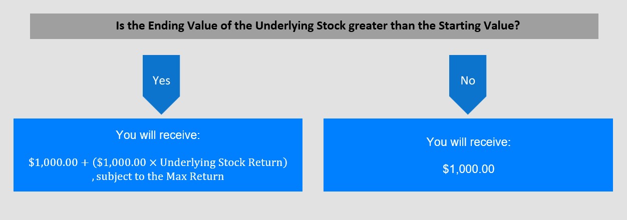 如果标的股票期末价值大于其起始价值的100%,到期时,您将获得100.00%的正股价值上涨上行敞口,但最大回报为45.00%;否则,到期时,您将获得本金。