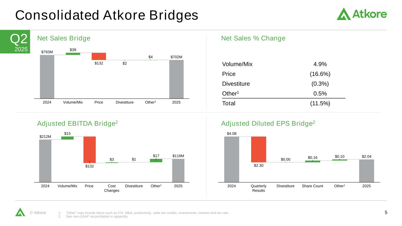 4©Atkore第二季度利润表摘要1。见附录中的非GAAP调节。2.调整后EBITDA利润率是调整后EBITDA占净销售额的百分比。(百万美元)2025年第二季度2024年第二季度同比变化Y/Y %变化净销售额701.7美元79 2.9美元(91.2美元)(11.5%)营业收入(51.8美元)178.8美元(230.6美元)(129.0%)净(亏损)/收入(50.1美元)138.0美元(188.1美元)(136.3%)调整后EBITDA 1 116.4美元211.9美元(95.5美元)(45.1%)调整后EBITDA利润率2 16.6% 26.7%(1010个基点)-税率24.7% 18.7% + 600个基点-每股净(亏损)/收入(稀释后)(1.46美元)3.67美元(5.13美元)(139.8%)调整后稀释后每股收益1美元2.04美元4.08美元(2.04美元)(50.0%)