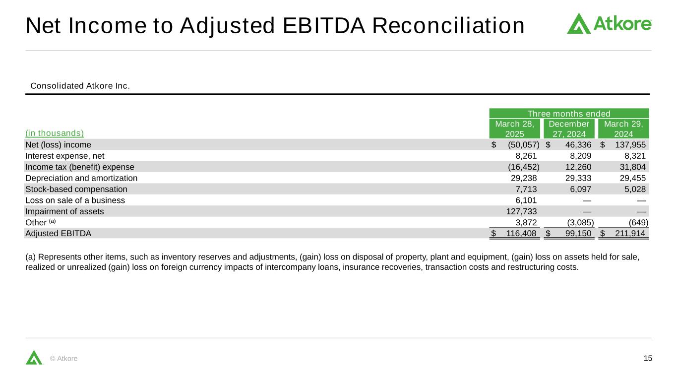 14©Atkore并表Atkore Inc.调整后摊薄每股收益对账(调整后每股摊薄收益)截至三个月(单位:千,每股数据除外)2025年3月28日2024年12月27日2024年3月29日,2024年净收入$(50,057)$ 46,336 $ 137,955股票薪酬7,7136,0975,028无形资产摊销10,16611,69914,221出售业务损失6,101 ——资产减值127,733 ——其他(a)3,103(3,441)(939)对净收入的税前调整154,81614,35518,310税收影响(38,704)(3,589)(4,578)与剥离业务相关的额外税收费用3,946 ——调整后净收入70,001美元57,102美元151,688加权平均稀释后已发行普通股34,29035,04037,166每股摊薄净收益$(1.46)$ 1.31 $ 3.67调整后每股摊薄净收益$ 2.041.63美元4.08美元(a)系其他项目,如库存准备金和调整数、处置不动产、厂房和设备的(收益)损失、持有待售资产损失、公司间贷款和保险追偿的外汇影响的已实现或未实现(收益)损失。