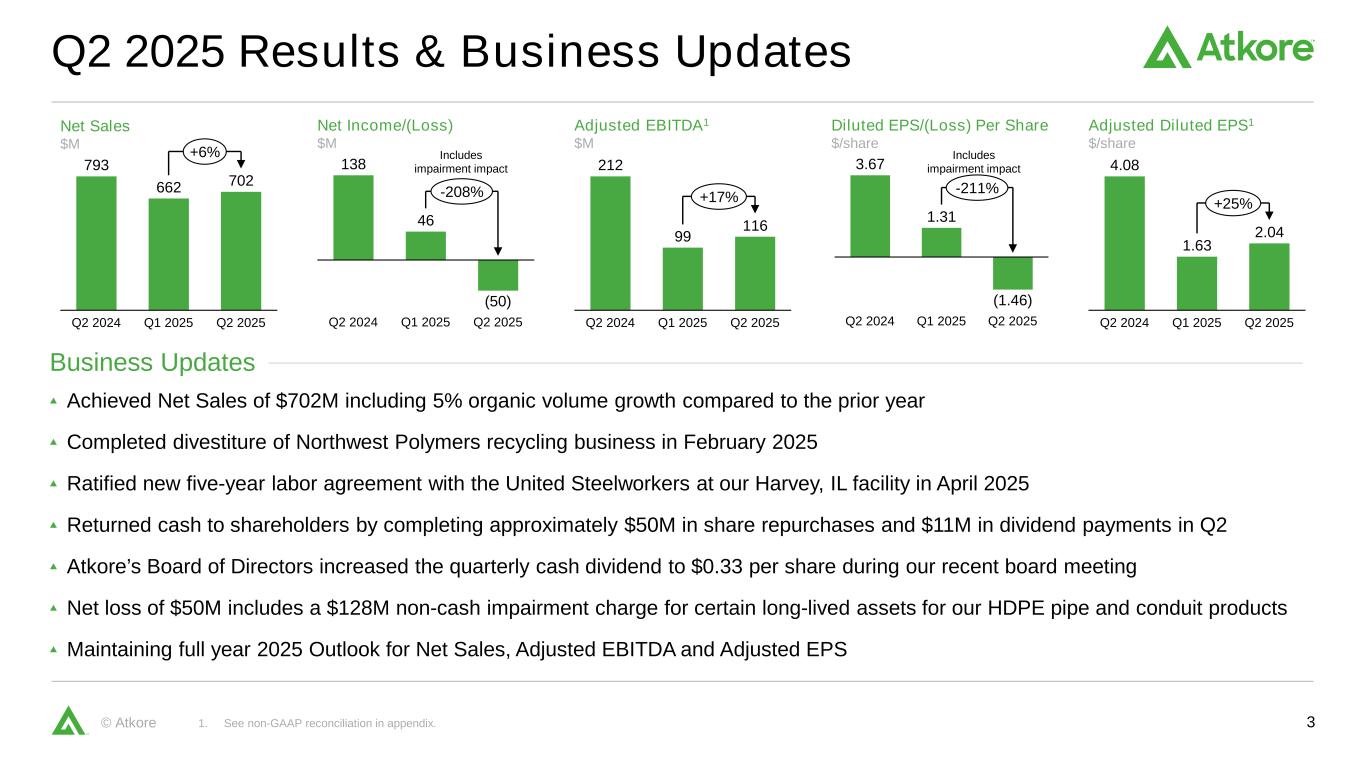 2©Atkore本演示文稿仅供一般参考之用,并不包括可能感兴趣的每一个项目,也无意就Atkore Inc.(“公司”或“Atkore”)或其运营和财务信息提供充分和公平的披露。除非联邦证券法要求,否则Atkore明确表示不打算由于新信息或未来事件或发展或其他原因而更新本演示文稿中包含的任何前瞻性陈述。本演示文稿不是招股说明书,也不是出售证券的要约。本演示文稿包含受已知和未知风险和不确定性影响的前瞻性陈述,其中许多风险和不确定性超出我们的控制范围。本演示文稿中除历史事实陈述外的所有陈述均为前瞻性陈述。本演示文稿中出现的前瞻性陈述包括但不限于关于我们的意图、信念、假设或当前预期的陈述,其中包括财务状况;经营业绩;现金流;前景;增长战略或预期;客户保留;法律、行政或监管程序、调查或检查的结果(通过判决或和解)和费用,包括但不限于集体、代表或任何其他诉讼;以及当前经济状况的影响。您可以通过与历史或当前事实不严格相关这一事实来识别前瞻性陈述。这些陈述可能包括“相信”、“预期”、“可能”、“将”、“应该”、“应该”、“将”、“可以”、“寻求”、“目标”、“项目”、“乐观”、“打算”、“计划”、“估计”、“预期”等类似词语。我们提醒您,前瞻性陈述并非对未来业绩或结果的保证,实际业绩和结果,包括但不限于我们的实际经营业绩、财务状况和流动性,以及我们经营所在市场的发展,可能与本演示文稿中包含的前瞻性陈述中做出或暗示的内容存在重大差异。此外,即使我们的经营业绩、财务状况和现金流以及我们经营所在市场的发展与本演示文稿中包含的前瞻性陈述一致,这些结果或发展可能并不代表后续期间的结果或发展。许多重要因素,包括但不限于公司向美国证券交易委员会提交的文件中披露的风险和不确定性,包括但不限于公司最近的10-K表格年度报告以及10-Q表格和8-K表格报告,可能导致实际结果和结果与前瞻性陈述中反映的结果和结果存在重大差异。由于存在这些风险,我们提醒您,您不应过分依赖我们的任何前瞻性陈述。新的风险和不确定性不时出现,我们无法预测那些事件或它们可能如何影响我们。此外,任何前瞻性陈述仅在作出之日起生效。我们不承担在本演示文稿日期之后修改本演示文稿中的前瞻性陈述的义务。本演示文稿中使用的市场数据和行业信息基于管理层对行业的了解和管理层的善意估计。在现有范围内,我们还依赖于管理层对独立行业调查、预测和出版物的审查以及由一些第三方来源编制的其他公开信息。本演示文稿中使用的所有市场数据和行业信息都涉及一些我们认为合理的假设和限制,但请注意不要对此类估计给予过度的权重。虽然我们认为这些来源是可靠的,但我们无法保证这些信息的准确性或完整性,我们也没有独立核实这些信息。虽然我们认为本演示文稿中包含的估计市场地位、市场机会和市场规模信息总体上是可靠的,但这些信息部分来自管理层的估计和信念,本质上是不确定和不精确的。对我们未来业绩的预测、假设和估计,以及我们经营所在行业的未来业绩,由于多种因素,具有高度的不确定性和风险, 包括上面描述的那些。这些因素和其他因素可能导致结果与我们的估计和信念以及独立方编制的估计中表达的结果存在重大差异。此列报方式应与Atkore的历史财务报表一起阅读,包括最近一期经审计的财务报表。历史结果可能并不代表未来的结果。我们使用非公认会计准则财务指标来帮助我们描述我们的运营和财务业绩。这些衡量标准可能包括调整后EBITDA、调整后EBITDA利润率(调整后EBITDA超过净销售额)、净债务(总债务减去现金和现金等价物)、调整后每股摊薄净收益(也称为“调整后摊薄每股收益”)、杠杆率(净债务或总债务减去现金和现金等价物,超过过去12个月调整后EBITDA(“TTM”)、自由现金流(经营活动提供的净现金减去资本支出)和资本回报率,以帮助我们描述我们的经营和财务业绩。这些非GAAP财务指标在我们的行业中普遍使用,具有一定的局限性,不应被解释为净收入、总债务、经营活动提供的净现金、资产回报率以及根据美国公认会计原则或GAAP确定的其他收入数据指标的替代方法,或作为更好的经营业绩指标。我们定义的这些非GAAP财务指标可能无法与其他公司提出的类似标题的非GAAP指标进行比较。我们对此类非公认会计准则财务指标的表述不应被解释为我们未来业绩将不受异常或非经常性项目影响的推断。请参阅本演示文稿的附录,了解此处介绍的非GAAP财务指标与根据GAAP确定的最具可比性的财务指标的对账。财政期间-公司的财政年度于9月30日结束。该公司的惯例是使用4-5-4日历建立季度结算。该公司的财政季度通常在12月、3月和6月的最后一个星期五结束。警示性声明