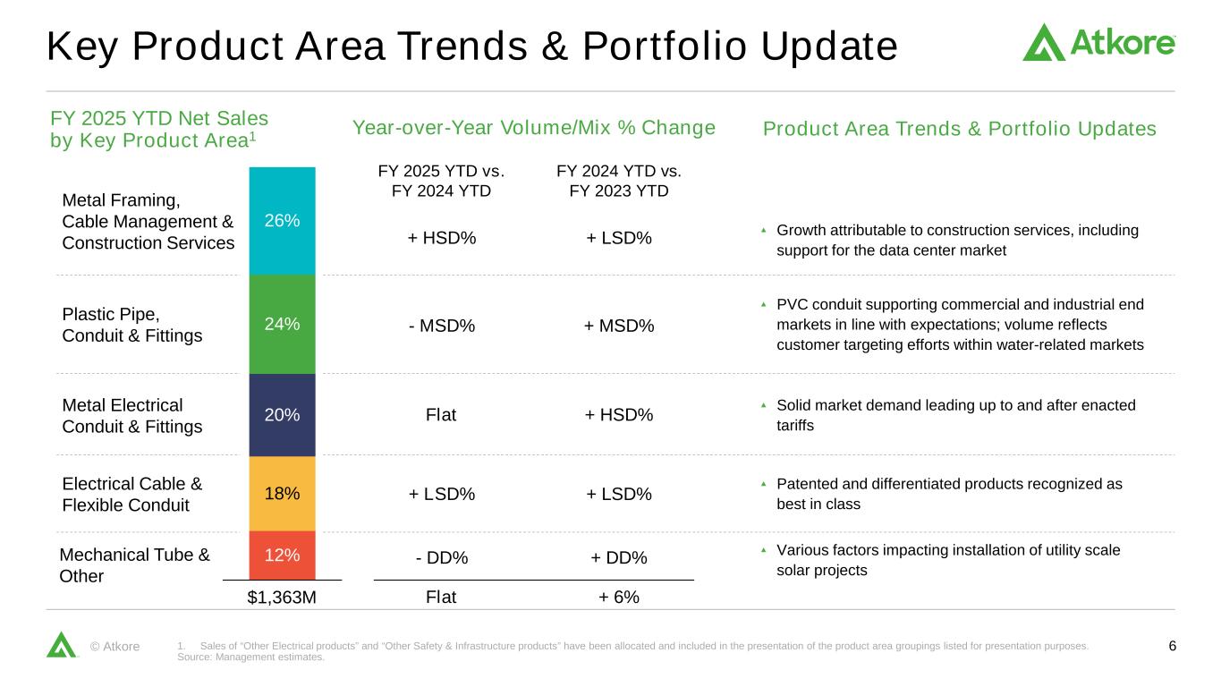 5©Atkore巩固Atkore桥梁1。“其他”可能包括F/X、并购、生产力、太阳能税收抵免、投资、利息和税率等项目。2.见附录中的非GAAP调节。调整后EBITDA Bridge2净销售额BridgeQ2 2025 $ 39 $ 132 $ 2 $ 4 2024数量/混合价格剥离Other12025 $ 7.93亿$ 7.02亿$ 15 $ 132 $ 3 $ 1 $ 17 2024数量/混合价格成本变化剥离Other12025 $ 2.12亿$ 1.16亿净销售额百分比变化调整后稀释EPS Bridge2数量/混合4.9%价格(16.6%)剥离(0.3%)Other1 0.5%总计(11.5%)$ 4.08 $ 2.04 $ 2.30 $ 0.16 $ 0.10 2024季度业绩$ 0.00剥离股份数Other12025