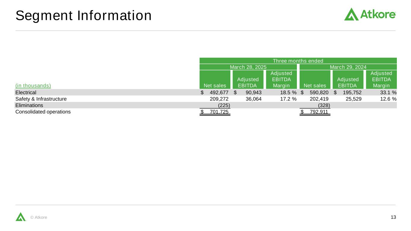 11©AtkoreAtkore:令人信服的投资出色的财务状况强劲的流动性状况,资产负债表随时可以支持和帮助推动未来的增长,包括我们最近再融资的基于资产的贷款协议多样化的高质量解决方案组合多样化的国产电气基础设施产品和服务解决方案组合,支持贯穿所有建设阶段的广泛终端市场应用,实现先进技术的增长,并确保将电力安全分配到数据中心、家庭、办公室和任何需要电力的地方。我们的产品和解决方案对于扩大可再生能源的获取、电网硬化、投资数字基础设施和电气化资本部署模式侧重于股东回报资本部署的纪律方法侧重于业务增长和向股东返还现金增长投资的机会以增强我们的建筑服务能力以支持全球大型项目并增加我们在与水相关的终端市场的参与