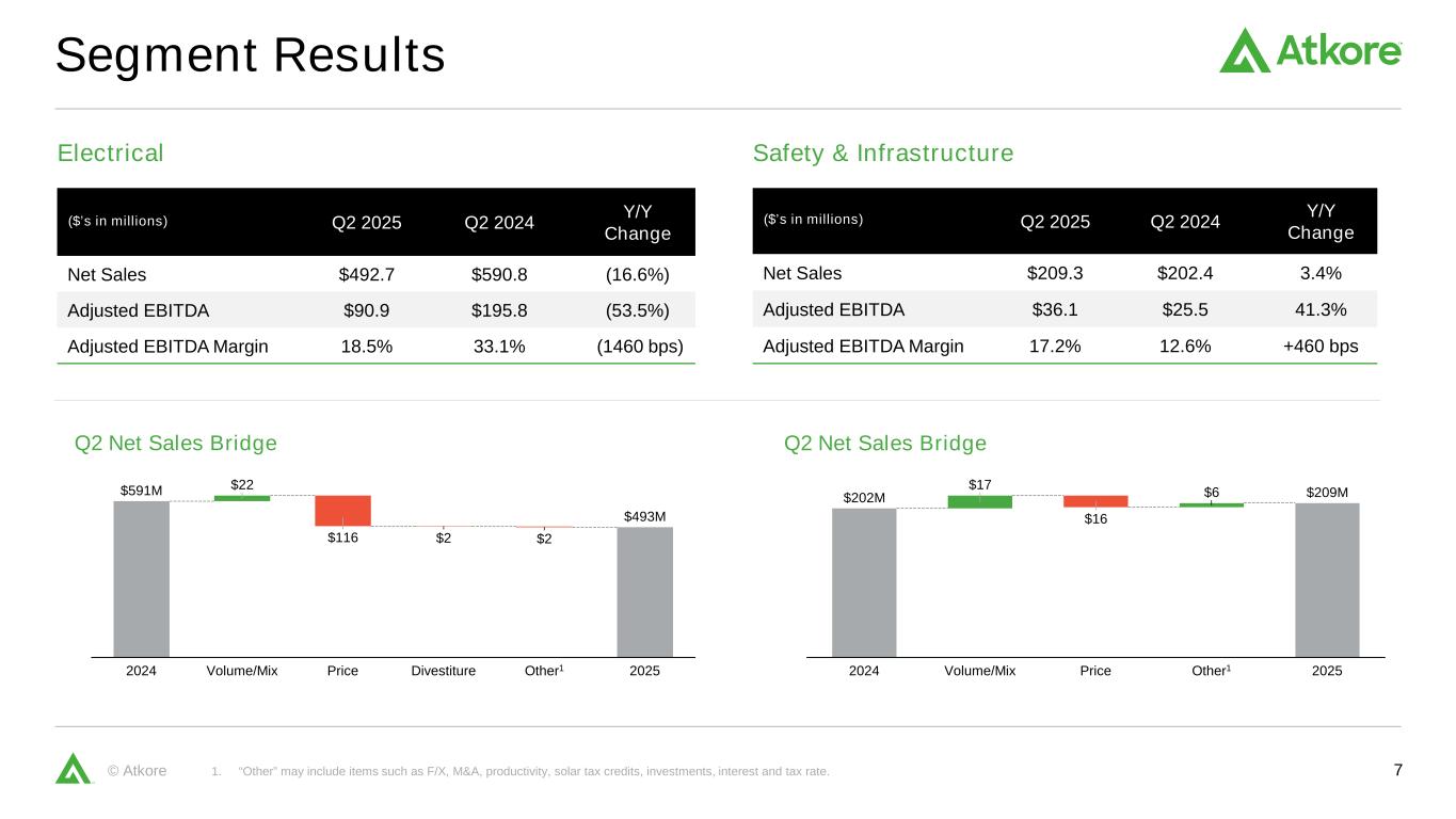 6©Atkore 2025财年年初至今按主要产品领域划分的净销售额1主要产品领域趋势和产品组合更新1。“其他电气产品”和“其他安全和基础设施产品”的销售已分配并纳入为演示目的而列出的产品区域分组的演示文稿中。资料来源:管理层估计。2025财年年初至今对比2024财年年初至今+ HSD %-MSD % Flat + LSD %-DDD % Flat机械管&其他增长归因于建筑服务,包括支持数据中心市场在颁布关税之前和之后的稳固市场需求PVC导管支持商业和工业终端市场符合预期;数量反映了与水相关市场内的客户定位努力专利和差异化产品被公认为同类最佳影响公用事业规模太阳能项目安装的各种因素2024财年年初至今与2023财年年初至今+ DD %产品区域趋势和投资组合更新同比数量/混合%变化26% 24% 20% 18% 12% 13.63亿美元金属框架、电缆管理和建筑服务塑料管道,导管&配件金属电气导管&配件电气电缆&柔性导管+ LSD % + MSD % + HSD % + LSD % + 6%