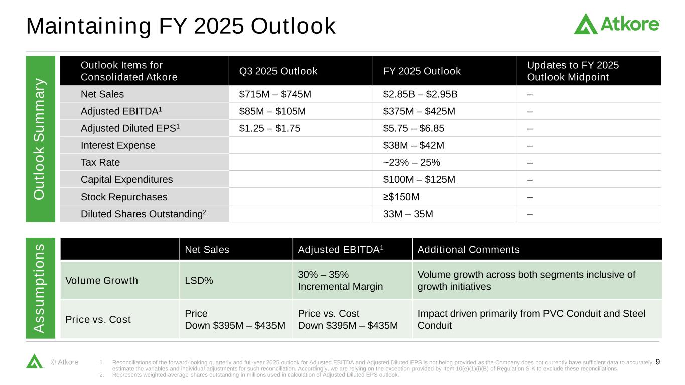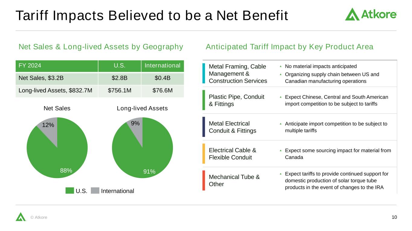 9©Atkore维持2025财年展望O ut lo ok S um m ar y 1。由于公司目前没有足够的数据来准确估计此类调节的变量和个别调整,因此没有提供调整后EBITDA和调整后稀释每股收益的前瞻性季度和2025年全年展望的调节。因此,我们依赖S-K条例第10(e)(1)(i)(b)项规定的例外情况来排除这些和解。2.表示用于计算调整后稀释每股收益前景的加权平均流通股,单位为百万股。展望项目对于合并的Atkore 2025年第三季度展望2025财年展望更新至2025财年展望中点净销售额7.15亿美元– 7.45亿美元$ 2.85B – $ 2.95B –调整后EBITDA 1 8500万美元– 1.05亿美元3.75亿美元– 4.25亿美元–调整后稀释后每股收益1美元1.25美元– 1.75美元5.75美元– 6.85美元–利息支出3800万美元– 4200万美元–税率~23% – 25% –资本支出1亿美元– 1.25亿美元–股票回购≥ 1.5亿美元–稀释后未偿还股份2.33亿美元– 3500万美元–净销售额调整后EBITDA 1额外评论交易量增长LSD % 30% – 35%增量利润率交易量增长包括增长举措在内的两个部门价格与成本价格下降3.95亿美元– 4.35亿美元价格与成本下降3.95亿美元– 4.35亿美元影响主要来自PVC管道和钢铁管道A SS um pt io ns