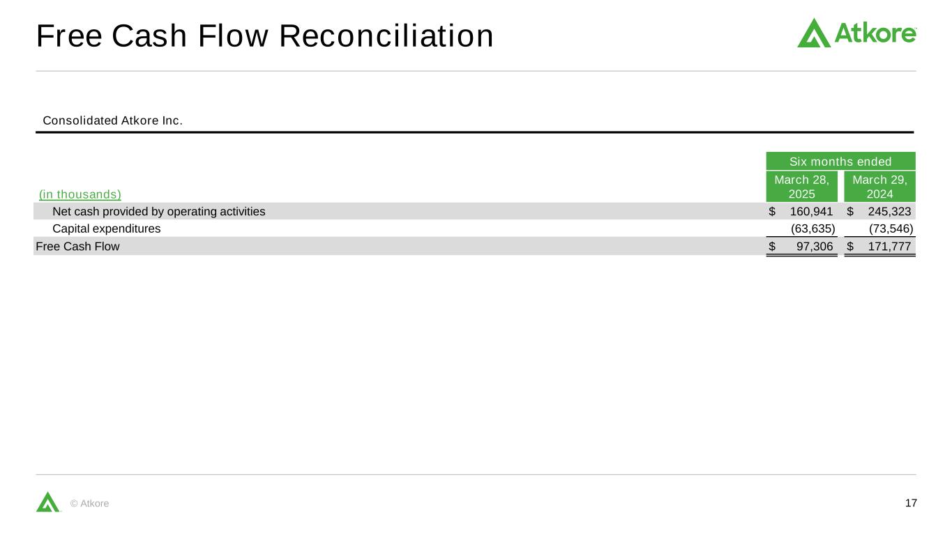 16©Atkore总债务与合并净债务比率(单位:千)2025年3月28日2024年12月27日2024年9月30日2024年6月28日2024年3月29日2023年12月29日长期债务$ 765,913 $ 765,375 $ 764,838 $ 764,300 $ 763,762 $ 763,225总债务765,913765,375764,838764,300763,762763,225减现金及现金等价物330,385310,444351,385303,657368,050380,922净债务$ 435,528 $ 454,931 $ 413,453 $ 460,643 $ 395,712 $ 382,303