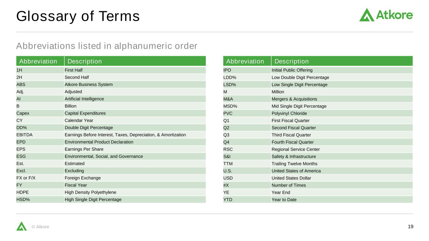 19©以字母数字顺序排列的Atkore简称术语表简称说明1H上半年2H下半年ABS Atkore业务系统调整后AI人工智能B十亿资本支出CY日历年DD %两位数百分比EBITDA息税折旧摊销前利润EPD环保产品申报EPS每股盈利ESG环境、社会、治理EST。估计不包括在内。不含外汇或F/X外汇FY财年HDPE高密度聚乙烯HSD %高个位数百分比简称说明IPO首次公开募股LDD %低双位数百分比LSD %低个位数百分比百万并购MSD %中个位数百分比PVC聚氯乙烯Q1第一财季Q2第二财季Q3第三财季Q4第四财季RSC区域服务中心S & I Safety & Infrastructure TTM过去12个月美国美国美元美元# x次数YE年结年初至今