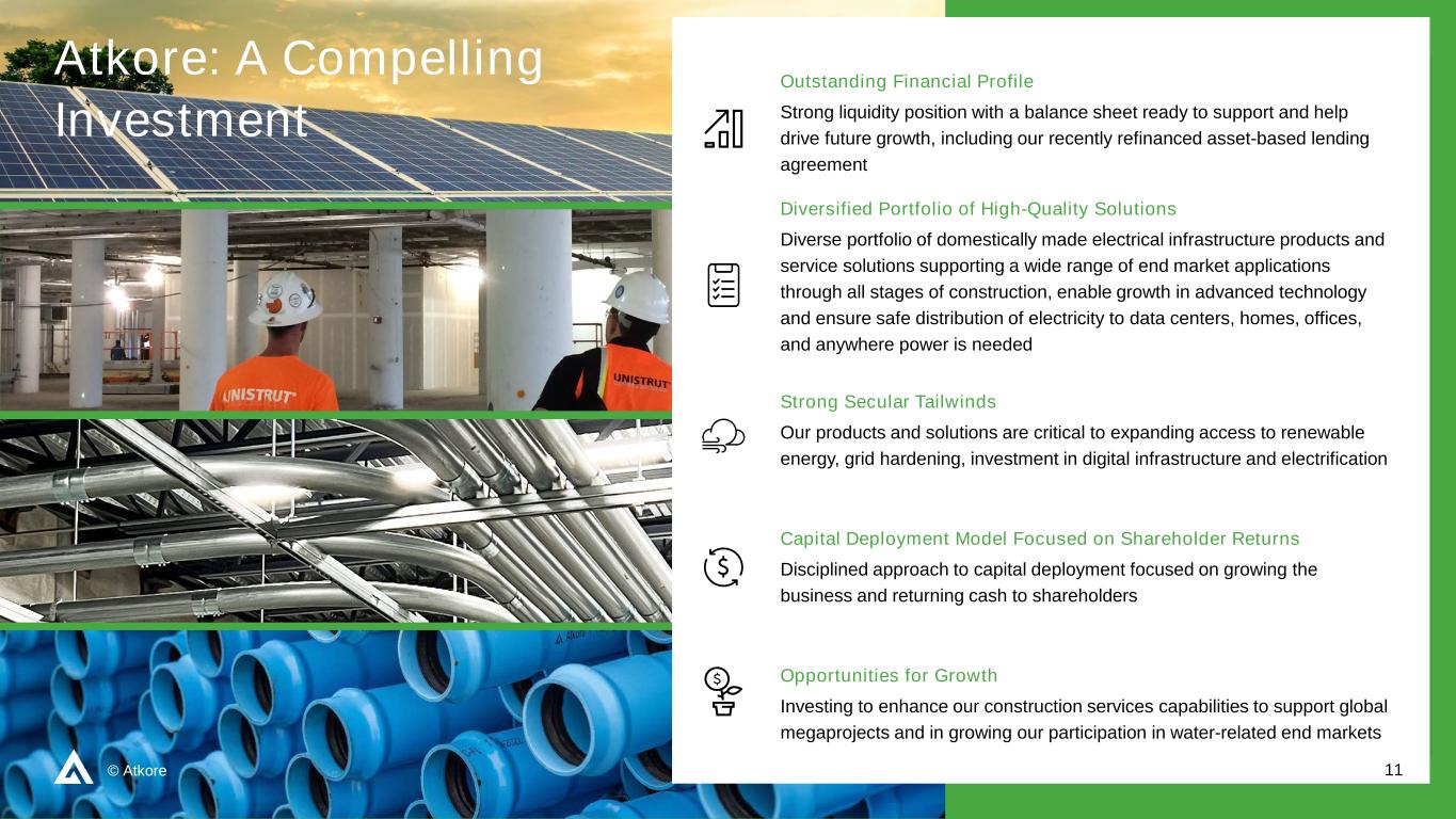 10©Atkore关税影响被认为是净收益金属框架、电缆管理和建筑服务预计没有实质性影响组织美国和加拿大制造业务之间的供应链塑料管道、管道和配件预计中国,中美洲和南美洲进口竞争将被征收关税金属电气管道和配件预计进口竞争将被征收多项关税电气电缆和柔性管道预计对来自加拿大机械管的材料产生一些采购影响&其他预计关税将在IRA净销售额发生变化的情况下为太阳能力矩管产品的国内生产提供持续的支持& 2024财年按地域划分的长期资产美国国际净销售额,$ 3.2B $ 2.8B $ 0.4B长期资产,8.327亿美元7.561亿美元7660万美元88% 12%美国国际净销售额91% 9%按关键产品领域划分的长期资产预期关税影响