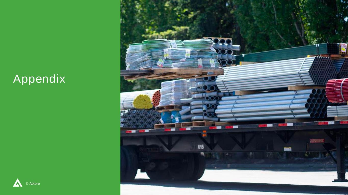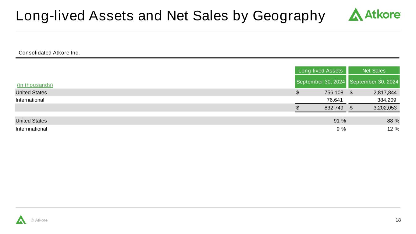 17©Atkore自由现金流对账合并丨截至六个月的Atkore Inc.(单位:千)2025年3月28日2024年3月29日经营活动提供的现金净额160,941美元245,323美元资本支出(63,635)(73,546)自由现金流97,306美元171,777美元