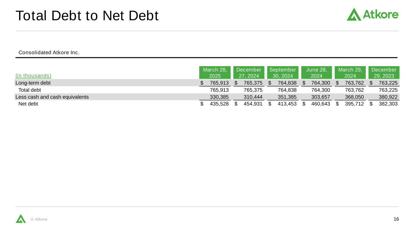 15©Atkore与调整后EBITDA对账的净收入截至三个月(单位:千)2025年3月28日2024年12月27日Atkore Inc. 2024年3月29日净(亏损)收入$(50,057)$ 46,336 $ 137,955利息支出净额8,2618,2098,321所得税(效益)费用(16,452)12,26031,804折旧和摊销29,23829,33329,455股票补偿7,7136,0975,028出售业务损失6,101 ——资产减值127,733 ——其他(a)3,872(3,085)(649)调整后EBITDA $ 116,408 $ 99,150 $ 211,914(a)代表其他项目,如库存储备和调整,处置不动产、厂房和设备的(收益)损失、持有待售资产的(收益)损失、公司间贷款的外汇影响的已实现或未实现(收益)损失、保险追偿、交易成本和重组成本。