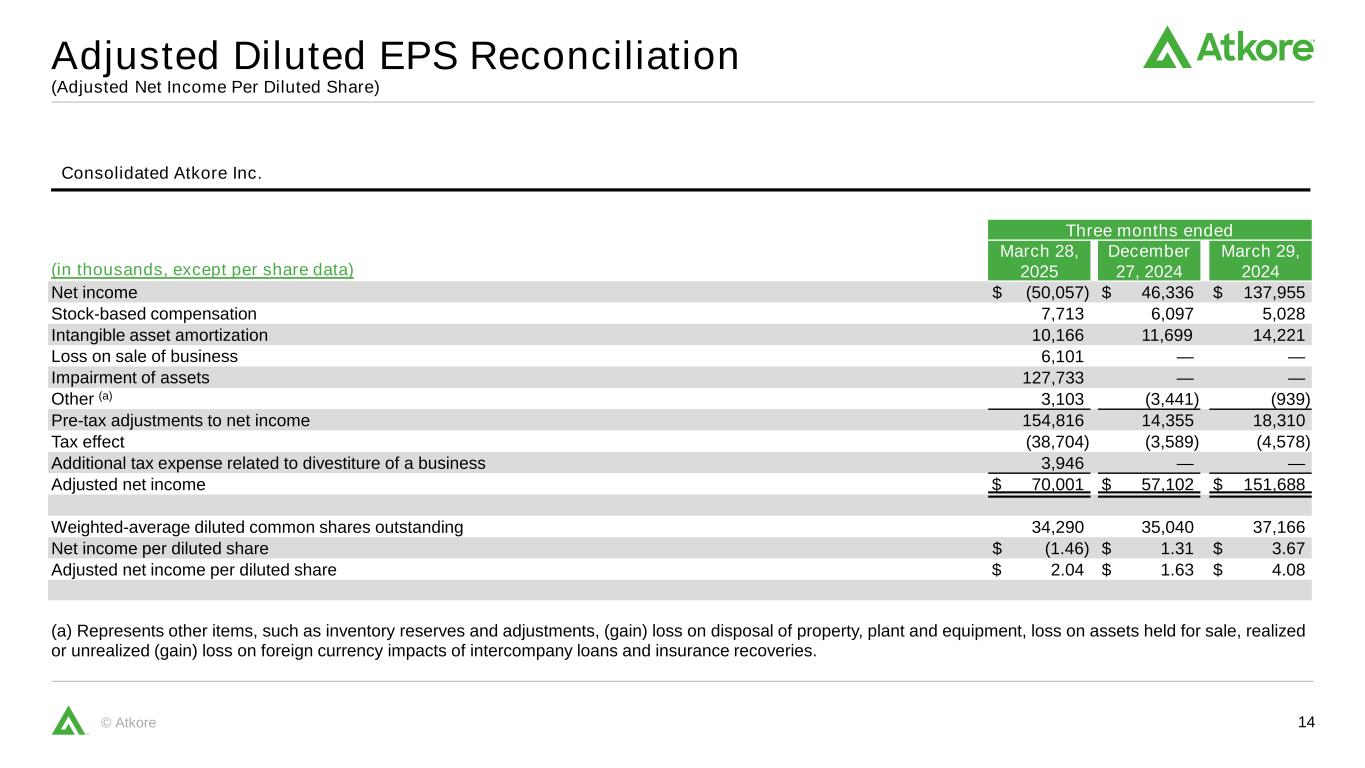13©Atkore分部信息截至2025年3月28日的三个月2024年3月29日(单位:千)调整后EBITDA调整后EBITDA利润率净销售额调整后EBITDA调整后EBITDA利润率净销售额调整后EBITDA调整后EBITDA利润率电气$ 492,677 $ 90,94318.5% $ 590,820 $ 195,75233.1% Safety & Infrastructure 209,27236,06417.2% 202,41925,52912.6% Eliminations(225)(328)合并运营$ 701,725 $ 792,911