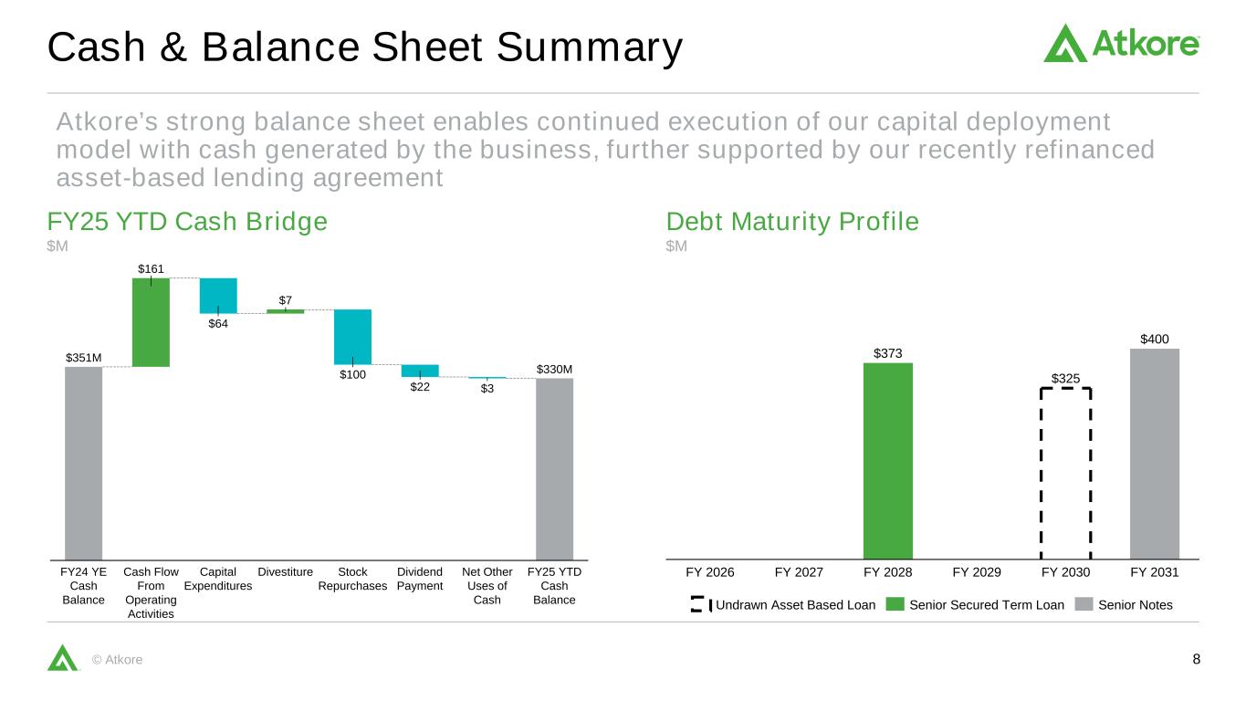7©Atkore分部业绩Q2净销售额Bridge Q2净销售额Bridge Electrical Safety & Infrastructure(百万美元)Q2 2025 Q2 2024 Y/Y变化净销售额$ 492.7 $ 590.8(16.6%)调整后EBITDA $ 90.9 $ 195.8(53.5%)调整后EBITDA利润率18.5% 33.1%(1460 bps)(百万美元)Q2 2025 Q2 2024 Y/Y变化净销售额$ 209.3 $ 202.4% 3.4%调整后EBITDA $ 36.1 $ 25.5 41.3%调整后EBITDA利润率17.2% 12.6% + 460 bps 1。“其他”可能包括F/X、并购、生产力、太阳能税收抵免、投资、利息和税率等项目。$ 22 $ 116 $ 2 $ 22024年成交量/混合价格其他1 2025年$ 5.91亿$ 4.93亿剥离$ 17 $ 16 $ 62024年成交量/混合价格其他1 2025年$ 2.02亿$ 2.09亿
