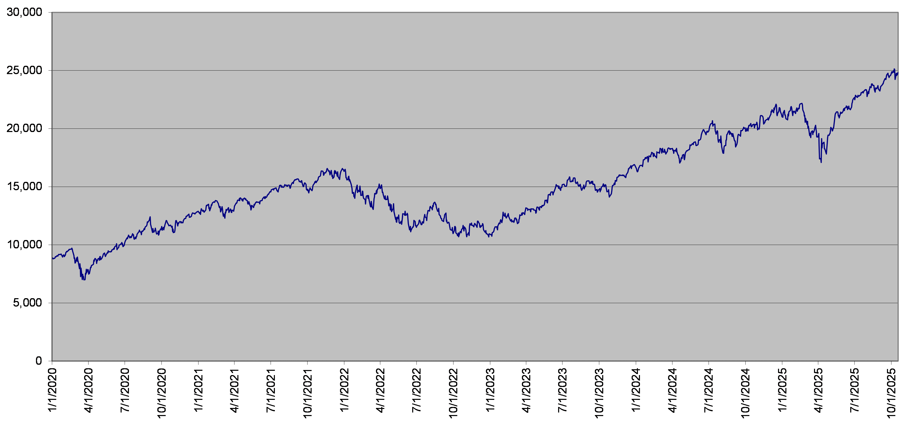 | NDX指数每日收盘水平 2020年1月1日至2025年10月17日 |