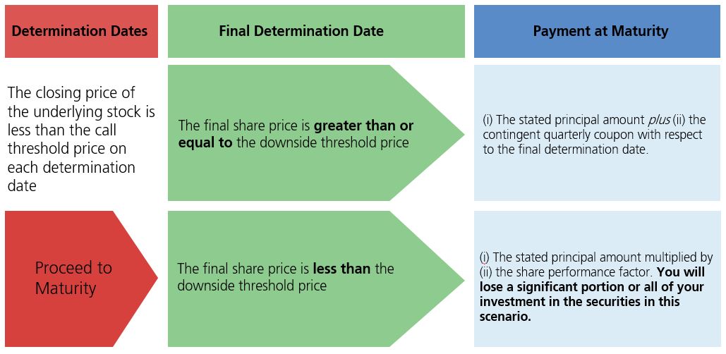 ▪如果最终股价大于或等于下跌门槛价:(i)规定的本金金额加上(ii)相对于最终确定日期的或有季度票息 ▪如果最终股价低于下跌门槛价:(i)规定的本金金额乘以(ii)股份表现因素 如果最终股价低于下跌门槛价,到期支付将低于规定本金金额的65.00%,并可能低至零。 |