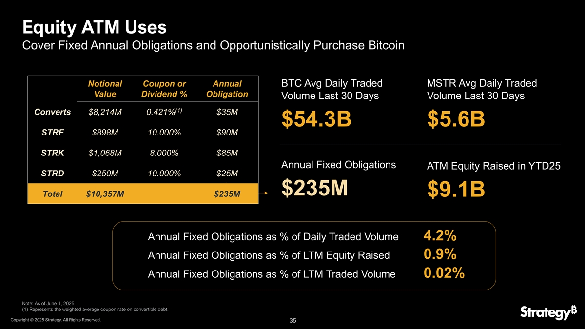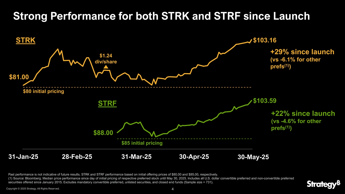 STRK和STRF均较上月表现强劲$ 103.59 STRF $ 103.16 + 13%上月STRK + 15%上月$ 91.65 $ 89.50 30-Apr-25 30-May-25~$ 2.4亿STRK于上月通过210亿美元ATM计划发行nd(1)~$ 4900万STRF自5月22日以来通过21亿美元ATM计划发行注意:过去的表现并不代表未来的结果。(1)21亿美元STRF ATM于2025年5月22日宣布成立。版权所有©2025年战略。版权所有。5