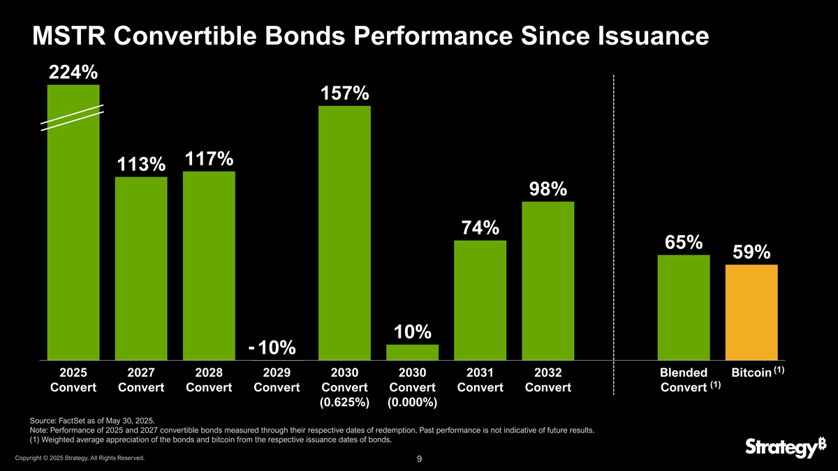 MSTR转债发行以来表现224% 157% 117% 113% 98% 74% 65% 59% 10%-10%(1)2025202720282028202920302030203020312032混合比特币(1)转换转换转换转换转换转换转换转换转换转换转换(0.625%)(0.000%)资料来源:FactSet,截至2025年5月30日。注:通过各自赎回日期衡量的2025和2027可转债表现。过去的表现并不代表未来的结果。(1)债券和比特币自各自发行日期的加权平均升值。版权所有©2025年战略。版权所有。9