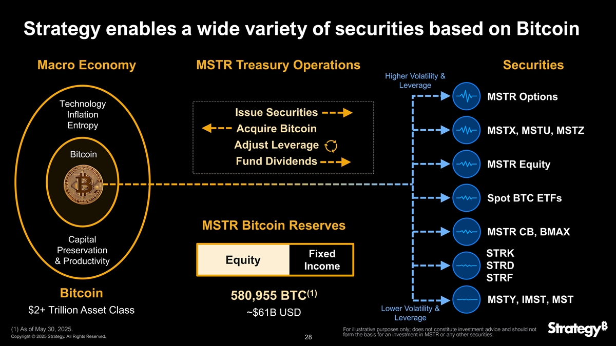 策略使能基于比特币宏观经济的种类繁多的证券MSTR财资操作证券较高的波动性&杠杆MSTR ETF(1)截至2025年5月30日,比特币580,955 BTC MSTY、IMST、MST较低的波动性& 2 +万亿美元资产类别~61B美元的美元杠杆(1)。仅用于说明目的;不构成投资建议,也不应构成对MSTR或任何其他证券的投资基础。版权所有©2025年战略。版权所有。28