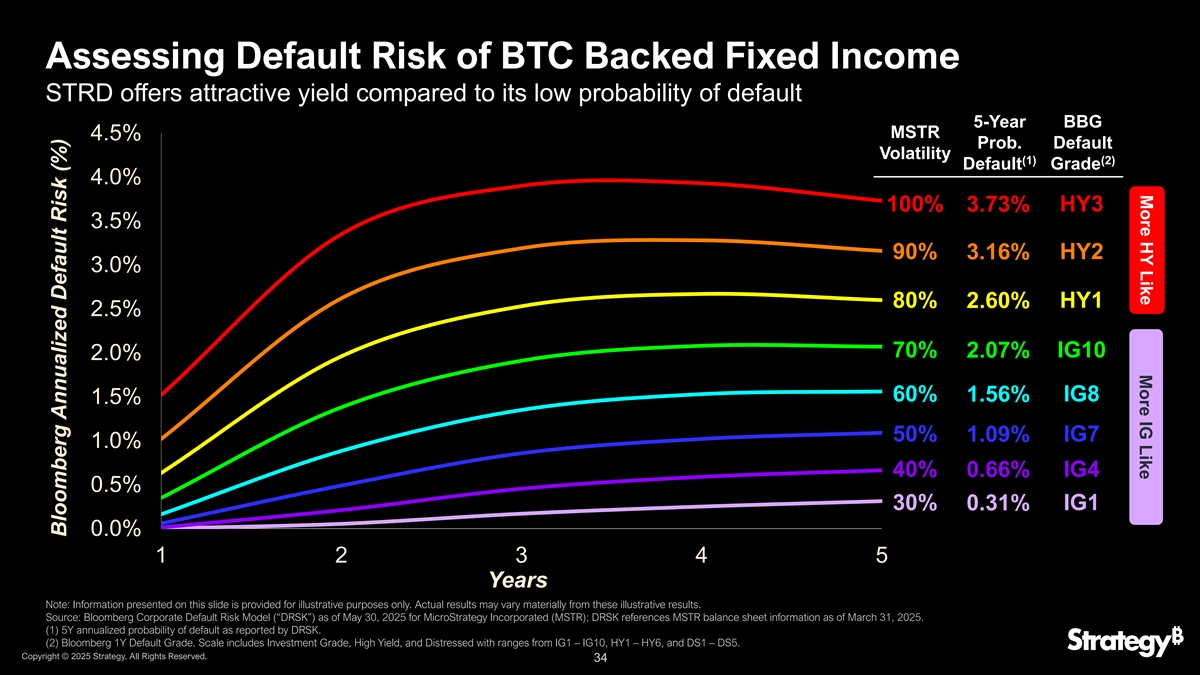 更多HY喜欢更多IG喜欢评估BTC支持的固定收益STRD的违约风险,与其违约概率较低的5年期彭博MSTR 4.5%的概率相比,它提供了有吸引力的收益率。违约波动率(1)(2)违约等级4.0% 100% HY3 3.73% 3.5% 90% HY2 3.16% 3.0% 80% HY1 2.60% 2.5% 70% 2.07% IG10 2.0% 60% 1.56% IG8 1.5% 50% IG7 1.09% 1.0% 40% 0.66% IG4 0.5% 30% 0.31% IG1 0.0% 12345年注:本幻灯片上提供的信息仅供说明之用。实际结果可能与这些说明性结果大不相同。资料来源:Bloomberg Corporate Default Risk Model(“DRSK”)for MicroStrategy Incorporated(MSTR),截至2025年5月30日;DRSK参考了截至2025年3月31日的MSTR资产负债表信息。(1)DRSK报告的5Y年化违约概率。(2)彭博1Y违约等级。规模包括投资级、高收益率、心疼IG1 – IG10、HY1 – HY6、DS1 – DS5等区间。版权所有©2025年战略。版权所有。34彭博年化违约风险(%)