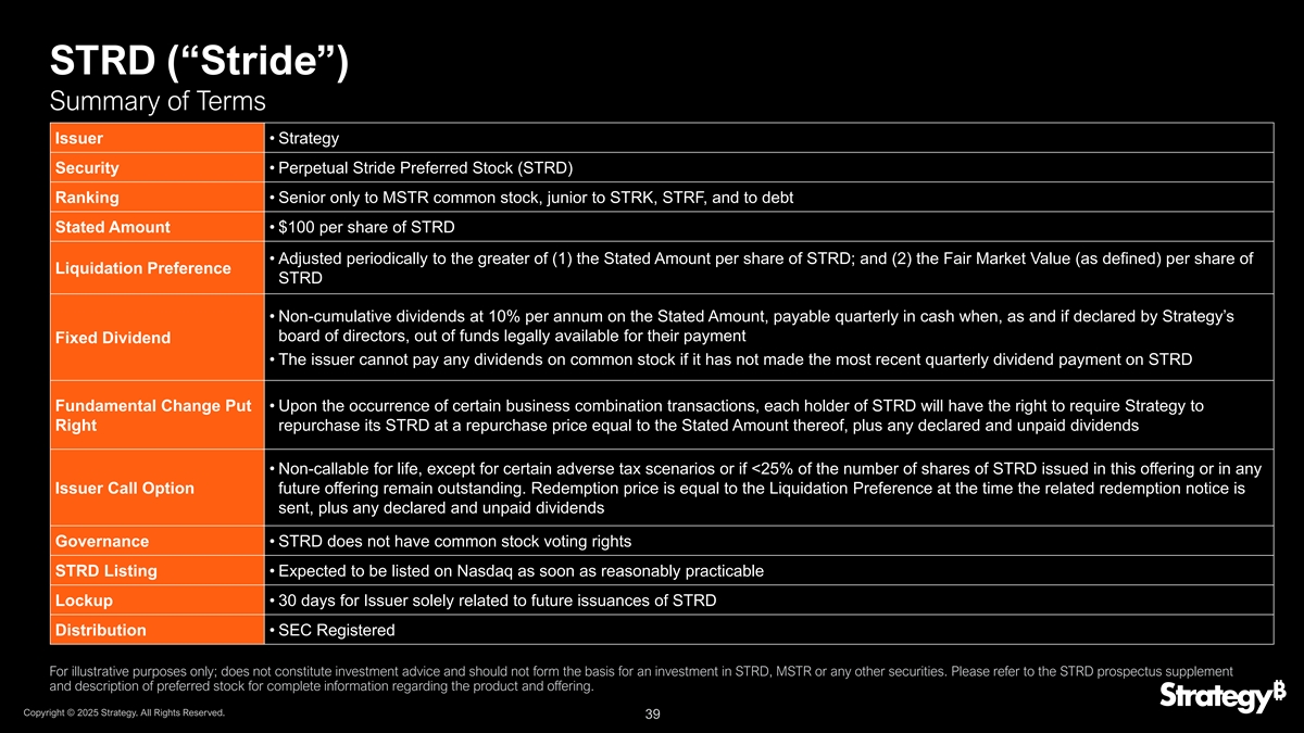STRD(“Stride”)条款发行人摘要• Strategy Security • Perpetual Stride Preferred Stock(STRD)排名•仅优先于MSTR普通股,低于STRK、STRF和债务规定金额• STRD每股100美元•定期调整为(1)STRD每股规定金额中的较大者;和(2)清算优先STRD每股公平市值(定义见)•按规定金额每年10%的非累积股息,在Strategy董事会宣布的情况下,每季度以现金支付,合法可供其支付的资金外固定股息•如果发行人未对STRD基本面变化看跌期权进行最近一个季度的股息支付,则发行人不能支付任何普通股股息•一旦发生某些企业合并交易,STRD的每个持有人将有权要求Strategy Right以等于规定金额的回购价格回购其STRD,加上任何已宣布和未支付的股息•终身不可赎回,除非在某些不利的税务情况下,或如果STRD在本次发行或任何发行人看涨期权未来发行中发行的股票数量的< 25%仍未发行。赎回价格等于相关赎回通知发送时的清算优先权,加上任何已宣布和未支付的股息治理• STRD没有普通股投票权STRD上市•预计将在合理可行的情况下尽快在纳斯达克上市锁定•发行人仅与STRD Distribution的未来发行相关的30天• SEC注册仅用于说明目的;不构成投资建议,也不应构成对STRD、MSTR或任何其他证券的投资基础。有关产品和发行的完整信息,请参阅STRD招股说明书补充和优先股说明。版权所有©2025年战略。版权所有。39