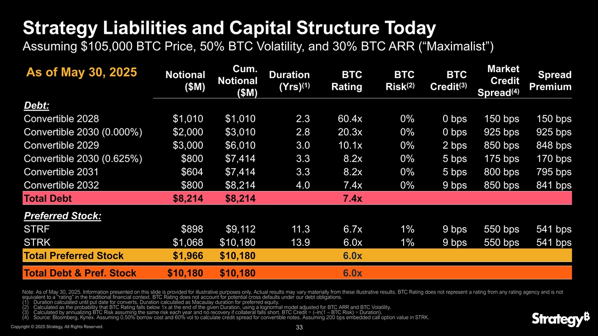 策略负债和资本Structure今天假设10.5万美元的BTC价格,50%的BTC波动率,0%的BTC ARR(“怀疑”)暨。市场截至5月30日,2025年名义存续期BTC BTC BTC价差名义信用(1)(2)(3)($ M)(YRs)评级风险信用溢价(4)($ M)价差债:可转换2028年$ 1,010 $ 1,0102.36 0.4x 0% 0 bps 150 bps 150 bps可转换2030(0.000%)$ 2,000 $ 3,0102.820.3x 0% 2 bps 925 bps 923 bps可转换2029 $ 3,000 $ 6,0103.0 10.1x 1% 42 bps 850 bps 808 bps可转换2030(0.625%)$ 800 $ 7,4143.38.2x 3% 95 bps 175 bps 80 bps可转换2031 $ 604 $ 7,4143.38.2x 3% 95 bps 800 bps 705 bps可转换2032 $ 800 $ 8,2144.07.4x 7% 174 bps 850 bps676bps总债务$ 8,214 $ 8,214 7.4x优先股:STRF $ 898 $ 9,11211.36.7x 39% 431 bps 550 bps 119 bps STRK $ 1,068 $ 10,18013.96.0x49 % 483bps 550 bps 67 bps总优先股$ 1,966 $ 10,1806.0x总债务&优先股。股票$ 10,180 $ 10,1806.0x注:截至2025年5月30日。本幻灯片上提供的信息仅供说明之用。实际结果可能与这些说明性结果大不相同。BTC Rating不代表任何评级机构的评级,也不等同于传统金融背景下的“评级”。BTC评级没有考虑到我们债务义务下的潜在交叉违约。(1)转换的存续期计算至认沽日。久期计算为优先股权的麦考利久期。(2)计算为BTC Rating在给定久期结束时跌破1x的概率,使用经过BTC ARR和BTC波动率调整的对数正态模型。(3)按每年承担相同风险且抵押品不足不收回的BTC风险年化计算。BTC Credit =(– ln(1 – BTC Risk)丨久期)。(4)资料来源:Bloomberg,Kynex。假设0.50%的借贷成本和60%的vol计算可转换票据的信用利差。假设STRK内嵌200个基点的看涨期权价值。版权所有©2025年战略。版权所有。32