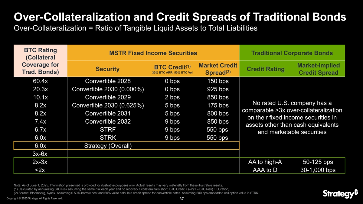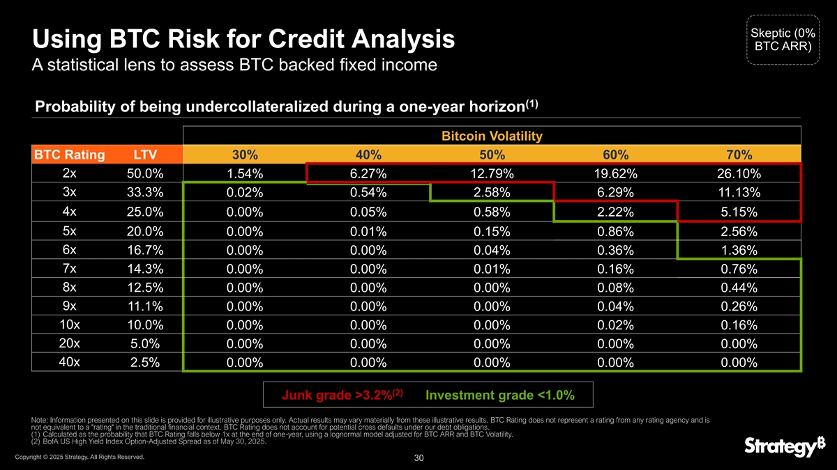 持怀疑态度(0%使用BTC风险用于信用分析BTC ARR)评估BTC支持的固定收益的统计镜头(1)一年期限内抵押不足的概率比特币波动BTC评级LTV 30% 40% 50% 60% 70% 2x 50.0% 1.54% 6.27% 12.79% 19.62% 26.10% 3x 33.3% 0.02% 0.54% 2.58% 6.29% 11.13% 4x 25.0% 0.00 %0.05% 0.58% 2.22% 5.15% 5x 20.0% 0.00 %0.05% 0.15% 0.86% 2.56% 6x 16.7% 0.00 %% 0.04% 0.36% 1.36% 7x 14.3% 0.00 %% 0.01% 0.16% 0.76% 8x 12.5% 0.00 %% 0.08% 0.44% 9x 11.1% 0.00 %% 0.00 %% 0.04% 0.26% 10x 10.00.000% 0.000% 0.000% 40x 2.5% 0.000% 0.000% 0.000% 0.000%(2)垃圾级> 3.2%投资级< 1.0%注:本幻灯片上提供的信息仅供说明之用。实际结果可能与这些说明性结果大不相同。BTC Rating不代表任何评级机构的评级,也不等同于传统金融背景下的评级。BTC评级不考虑我们债务义务下的潜在交叉违约。(1)计算为BTC Rating在1年期末跌破1x的概率,使用经过BTC ARR和BTC波动率调整的对数正态模型。(2)截至2025年5月30日美国银行美国高收益指数期权调整价差。版权所有©2025年战略。版权所有。30