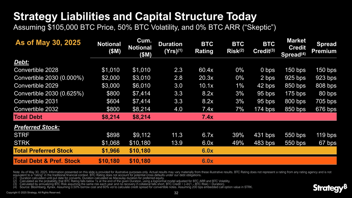 STRF推出前的策略负债和资本Structure假设价格为83,000美元BTC,50% BTC波动率,0% BTC ARR(“怀疑”)暨。截至3月16日,2025年名义存续期BTC BTC BTC名义(1)(2)(3)($ M)(YRs)评级风险信用($ M)债务:可转换2028年$ 1,010 $ 1,0102.54 1.0x 0% 0 bps可转换2030(0.000%)$ 2,000 $ 3,0103.01 3.8x 0% 15 bps可转换2029年$ 3,000 $ 6,0103.26.9x 4% 140 bps可转换2030(0.625%)$ 800 $ 7,4143.55.6x 8% 254 bps可转换2031 $ 604 $ 7,4143.55.6x 8% 254 bps可转换2032 $ 800 $ 8,2144.25.0x 15% 371 bps总债务$ 8,214 $ 8,214 5.0x优先股:STRK $ 742 $ 8,95613.9 4.6x 54% 565 bps总优先股股票8,956美元8,956美元4.6x注:截至2025年3月16日。本幻灯片上提供的信息仅供说明之用。实际结果可能与这些说明性结果大不相同。BTC Rating不代表任何评级机构的评级,也不等同于传统金融背景下的“评级”。BTC评级不考虑我们债务义务下的潜在交叉违约。(1)转换的存续期计算至认沽日。久期计算为优先股权的麦考利久期。(2)计算为BTC Rating在给定久期结束时跌破1x的概率,使用经过BTC ARR和BTC波动率调整的对数正态模型。(3)按每年承担相同风险且抵押品不足不收回的BTC风险年化计算。BTC Credit =(– ln(1 – BTC Risk)丨久期)。版权所有©2025年战略。版权所有。31