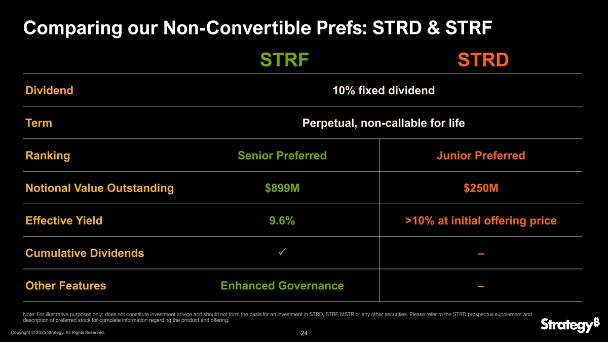 比较我们的不可转换优先股:STRD & STRF STRF STRD股息10%固定股息期限永久、终身不可赎回排名高级优先股初级优先股名义价值突出8.99亿美元2.5亿美元有效收益率9.6% > 10%按首次发行价格累计股息p –其他特征增强治理–注:仅供说明之用;不构成投资建议,也不应构成投资STRD、STRF、MSTR或任何其他证券的基础。有关产品和发行的完整信息,请参阅STRD招股说明书补充和优先股说明。版权所有©2025年战略。版权所有。24 24