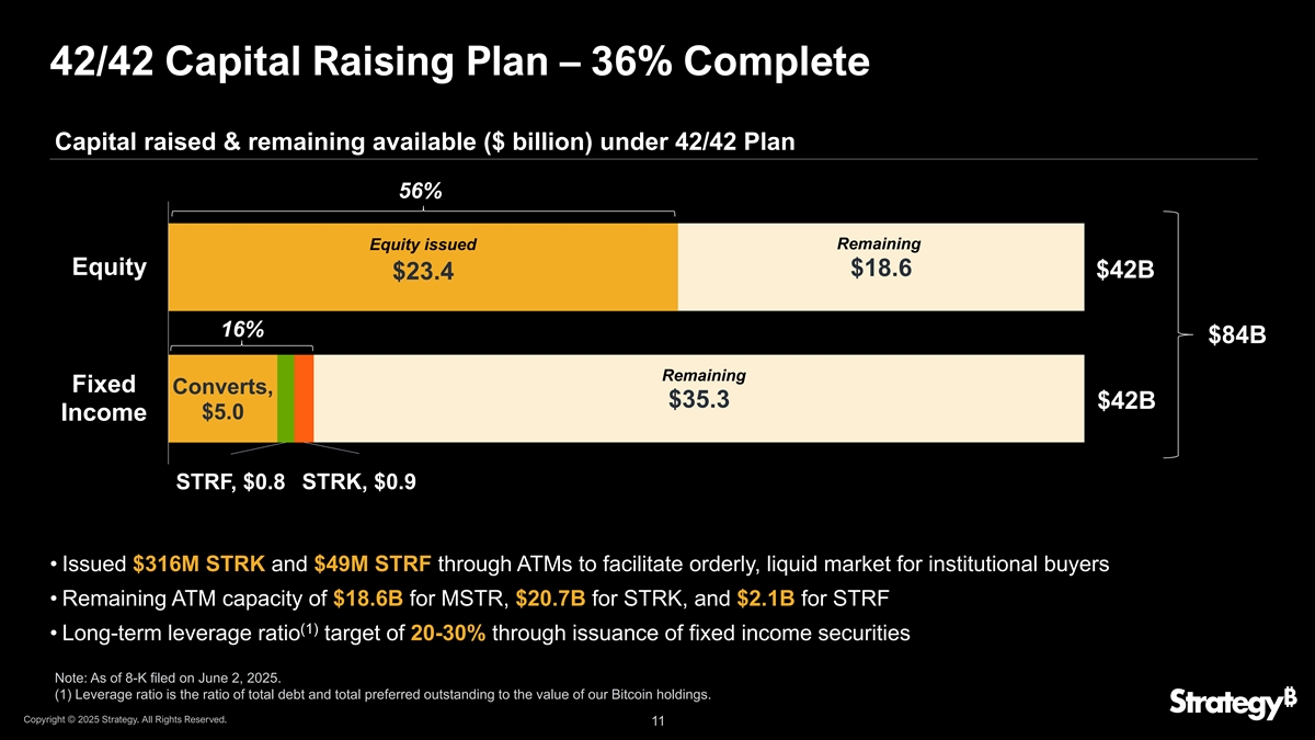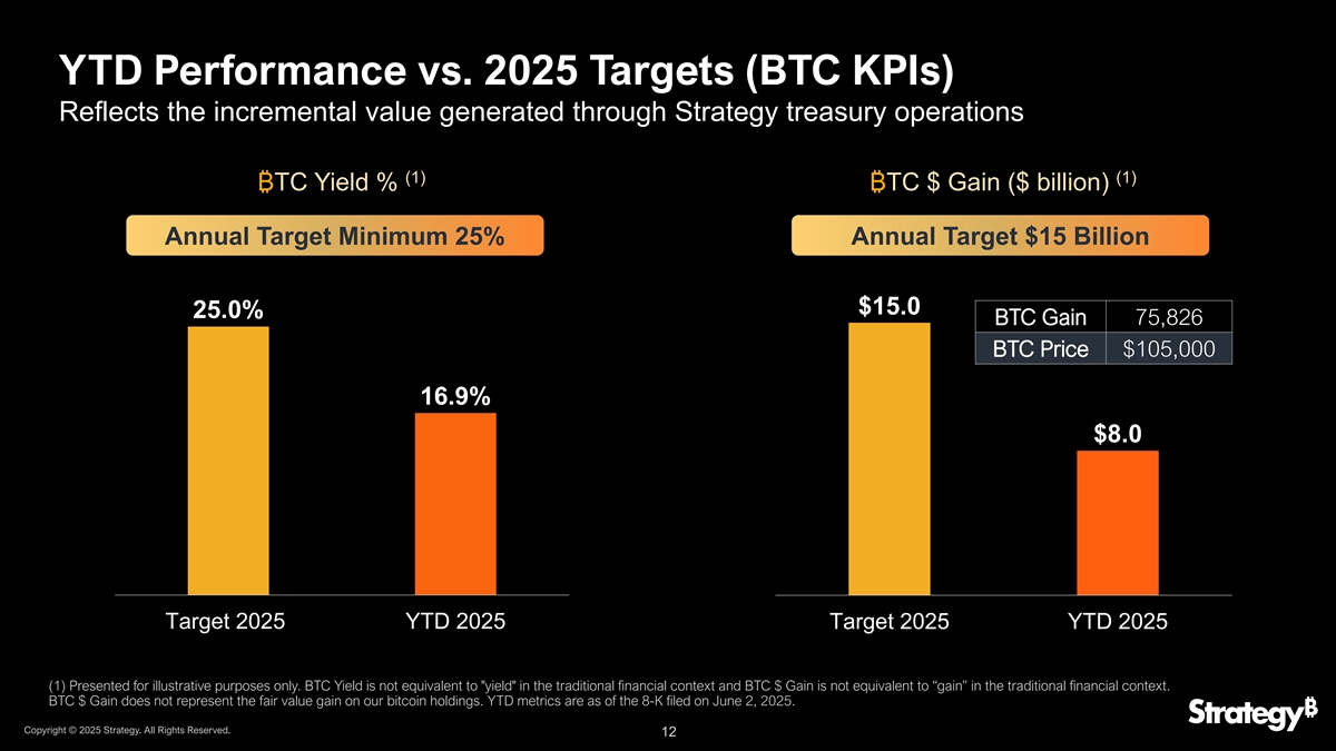 42/42融资计划–根据42/42计划,36%完全筹集的资本和剩余可用(十亿美元)56%剩余股权已发行股权$ 18.6 $ 42B $ 23.416% $ 84B剩余固定转换,$ 35.3 $ 42B $ 5.0收入STRF,$ 0.8 STRK,$ 0.9 •通过ATM发行3.16亿美元STRK和4900万美元STRF,以促进机构买家有序、流动的市场•剩余ATM容量为$ 18.6B的MSTR、$ 20.7B的STRK和$ 2.1B的STRF(1)•通过发行固定收益证券实现20-30 %的长期杠杆率目标注:截至2025年6月2日提交的8-K。(1)杠杆率是总债务和未偿优先股总额与我们持有的比特币价值的比率。版权所有©2025年战略。版权所有。11