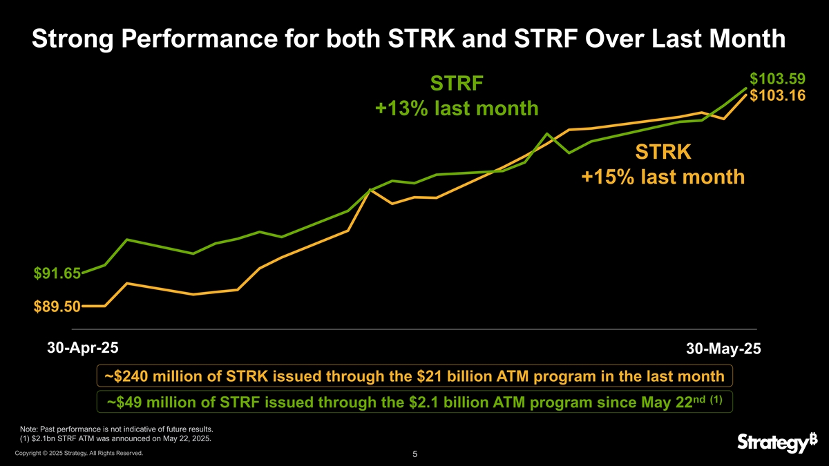 STRK和STRF自推出以来的强劲表现$ 103.16 STRK自推出以来+ 29% $ 1.24(vs.-6.1 % for other div/share(1)prefs)$ 81.00 $ 80初始定价$ 103.59 STRF自推出以来+ 22%(vs.-4.6 % for other(1)prefs)$ 88.00 $ 85初始定价31-Jan-25 28-Feb-25 31-Mar-25 30-Apr-25 30-May-25过去的表现并不代表未来的结果。STRK和STRF业绩分别基于80.00美元和85.00美元的初始发行价格。(1)资料来源:彭博。自相应优先股初始定价之日起至2025年5月30日的价格表现中值。包括自2015年1月以来提供的所有美元可转换优先和不可转换优先证券。不包括强制可转换优先、非上市证券、封闭式基金(样本量= 731)。版权所有©2025年战略。版权所有。4