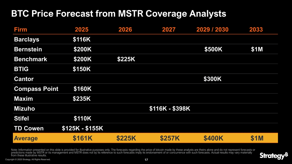 最后一件事是,你知道,很多人问——好吧,我们如何看待比特币价格可能接近什么水平。因此,我们在这里看到的是,我们汇总了所有分析师的观点,以及他们在不同模型中对比特币价格的预测。你可以在这里看到2025年的平均价格预测为161,000美元,比我们今天的水平上涨了50%。展望2026年,22.5万美元。三年预测为257,000美元。甚至有一位分析师(Bernstein)将目光投向了这8年后的2033年,100万美元的比特币价格。所以这些是人们在考虑投资STRD时可以考虑的一些参考点,以及比特币可能会变成什么以及MSTR可能会变成什么。
