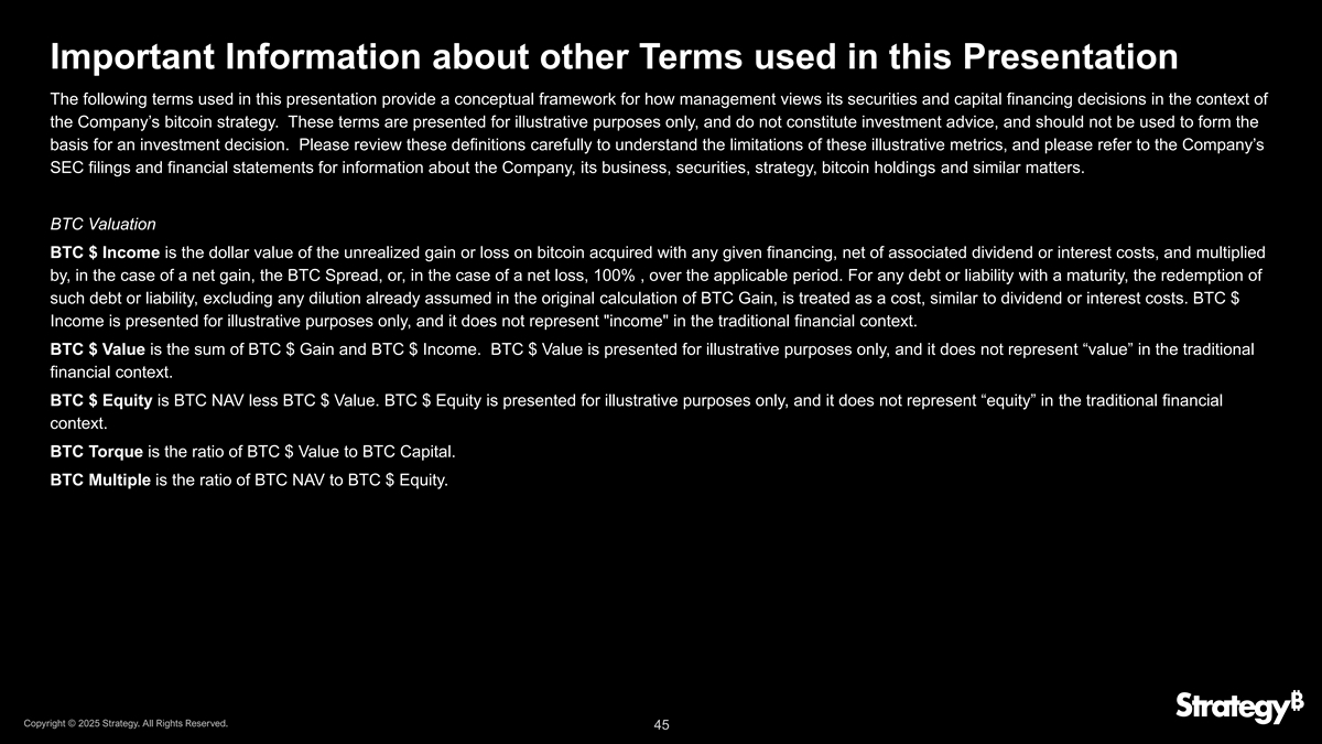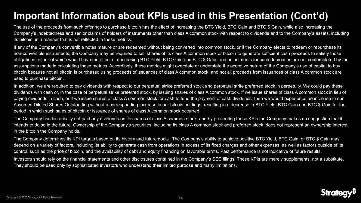 有关本演示文稿(续)中使用的KPI的重要信息,当公司使用这些KPI时,管理层会考虑到这些指标的各种限制,包括:•不考虑债务、优先股和其他优先于普通股的负债和对公司资产的债权;•假设所有债务将按照各自的条款进行再融资,或者在公司的优先可转换债务工具和可转换优先股的情况下,将其转换为普通股股份。BTC收益率、BTC收益和BTC $收益不是,也不应被理解为经营业绩衡量标准或财务或流动性衡量标准。具体来看:• BTC收益率并不等同于传统金融背景下的“收益率”。它不是衡量公司股东通过购买公司股票在历史上或在未来可能实现的投资回报,也不是衡量公司运营或持有比特币产生的收入、持有比特币的投资回报,或衡量其业务或资产表现的任何其他类似财务指标。• BTC收益和BTC $收益并不等同于传统金融背景下的“收益”。它们也不是衡量公司股东在历史上或未来通过购买公司股票可能实现的投资回报,也不是衡量公司运营或持有比特币产生的收入、持有比特币的投资回报,或衡量其业务或资产表现的任何其他类似财务指标。还需要了解的是,BTC $ Gain并不代表公司持有的比特币的公允价值收益,在公司持有的比特币发生公允价值损失期间,BTC $ Gain可能为正。公司A类普通股的交易价格除了公司持有的比特币数量以及已发行的A类普通股的实际或潜在股份数量之外,还受到多种因素的影响,因此,公司证券的市场价值相对于公司持有的比特币的市场价值可能会出现折价或溢价交易,BTC收益率、BTC收益和BTC $收益都不能指示或预测公司证券的交易价格。如上所述,这些KPI的目的很窄,管理层用来帮助其评估公司是否以仅与其持有的比特币有关的方式以增加股东的方式筹集和部署资本。在计算这些KPI时,该公司没有考虑用于收购其比特币的资金来源。具体而言,该公司指出,它已使用以下发行的收益收购了比特币:•不可转换工具,例如其2028年到期的6.125%优先有担保票据(该公司已赎回)和10.00% A系列永久冲突优先股;•可转换优先票据和可转换优先股,它们在发行时具有并可能不时具有高于公司普通股当前交易价格的转换价格,或者,在可转换优先票据的情况下,具有当时不可行使的转换权。版权所有©2025年战略。版权所有。43