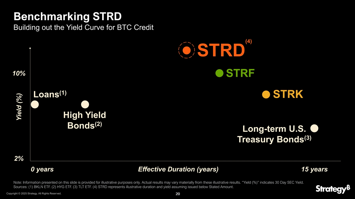 对标STRD构建BTC信贷的收益率曲线(4)12% STRD 11% 10% 10% STRF 9%(1)8%贷款STRK 7% 6%高收益(2)债券5%长期美国(3)4%国债3% 2% 2% 0.0002.0004.0006.0008.00010.00012.00014.00016.00000年有效期限(年)15年注:本幻灯片上提供的信息仅供说明之用。实际结果可能与这些说明性结果大不相同。“收益率(%)”表示30天SEC收益率。资料来源:(1)BKLN ETF。(2)HYG ETF。(3)TLT ETF。(4)STRD代表说明性的期限和收益率,假设发行的金额低于规定的金额。版权所有©2025年战略。版权所有。2020年收益率(%)