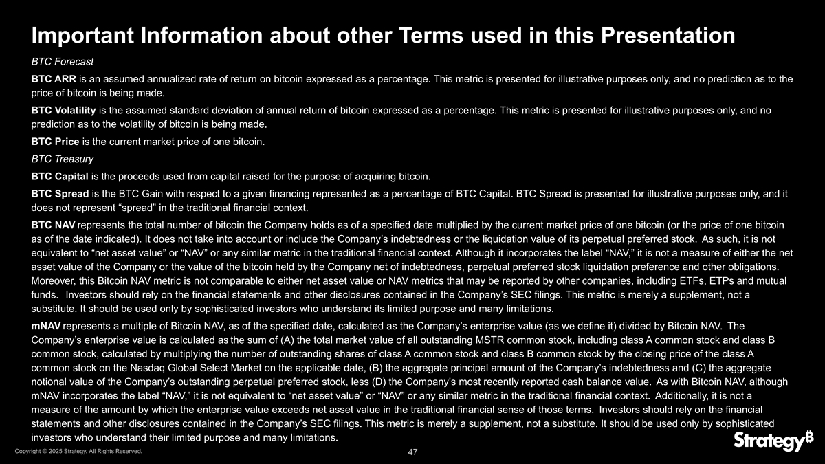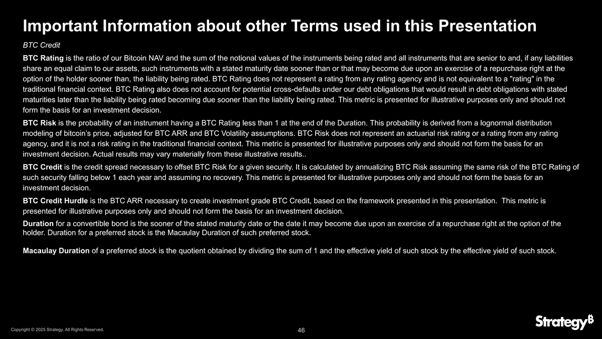 有关本演示文稿中使用的其他术语的重要信息BTC Credit BTC Rating是我们的比特币NAV的比率,以及被评级工具和所有优先于并且(如果有任何负债对我们的资产享有同等债权)的工具的名义价值之和,这些工具的规定到期日早于或可能在持有人选择行使回购权时更早到期的工具,被评级的负债。BTC Rating不代表任何评级机构的评级,也不等同于传统金融背景下的评级。BTC Rating也没有考虑到我们债务义务下的潜在交叉违约,这将导致规定期限晚于被评级负债的债务义务比被评级负债更早到期。该指标仅用于说明目的,不应构成投资决策的基础。BTC风险是指在存续期结束时,BTC评级小于1的工具的概率。这个概率是从比特币价格的对数正态分布模型中得出的,并根据BTC ARR和BTC波动率假设进行了调整。BTC Risk不代表精算风险评级或任何评级机构的评级,也不是传统金融背景下的风险评级。该指标仅用于说明目的,不应构成投资决策的基础。实际结果可能与这些说明性结果大不相同……BTC信用是为给定证券抵消BTC风险所必需的信用利差。它是通过对BTC Risk进行年化计算,假设每年此类证券的BTC评级低于1的风险相同,并假设没有恢复。此指标仅用于说明目的,不应构成投资决策的基础。BTC Credit Hurdle是创建投资级BTC信用所必需的BTC ARR,基于本演示文稿中介绍的框架。该指标仅用于说明目的,不应构成投资决策的基础。可转换债券的存续期是规定的到期日或持有人选择行使回购权时可能到期的日期中较早的日期。优先股的存续期是这种优先股的麦考利存续期。麦考利优先股的存续期是将1和该股票的有效收益率除以该股票的有效收益率得到的商。版权所有©2025年战略。版权所有。46