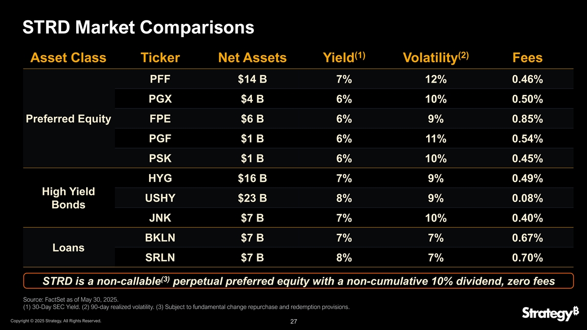 STRD被战略性地放置以优化杠杆~$ 8B转换STRD提高转换、STRF和STRK的BTC评级(1)~$ 3B STRF(1)~$ 22B STRK~$ 0.25B STRD STRD增加智能(1)~$ 130B对MSTR的杠杆MSTR~$ 61B BTC BTC(1)包括当前未偿金额和来自相应ATM的剩余可用容量。注:截至2025年5月30日版权所有©2025年战略。版权所有。26