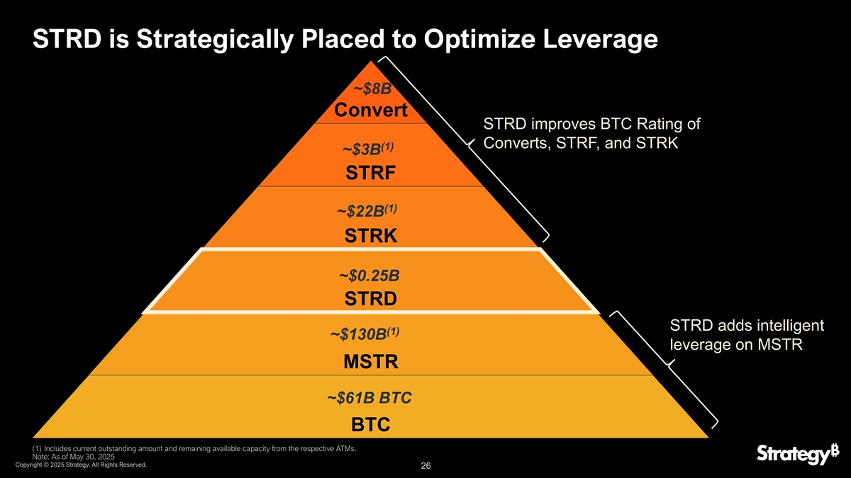 将我们的资本Structure建立在比特币风险最低的基础上,~$ 8B部分上行转换(1)~$ 3B皇冠上的明珠STRF研究金与(1)~$ 22B津贴STRK高收益~$ 0.25B STRD高波动性,(1)~$ 130B杠杆BTC TERM0数字~$ 61B BTC资本BTC(1)包括当前未偿金额和相应ATM的剩余可用容量。注:截至2025年5月30日版权所有©2025年战略。版权所有。25
