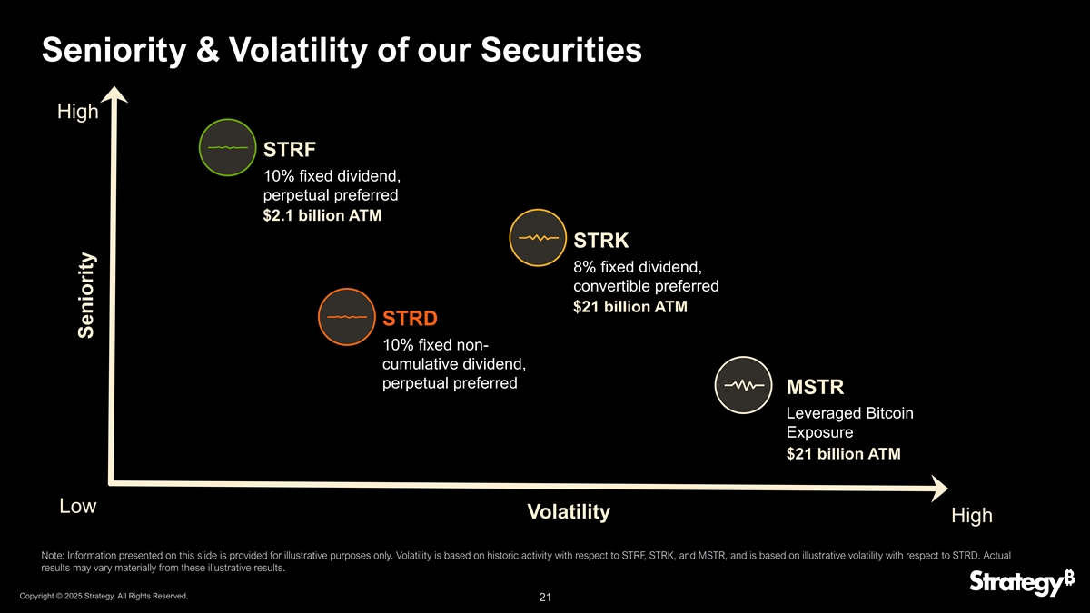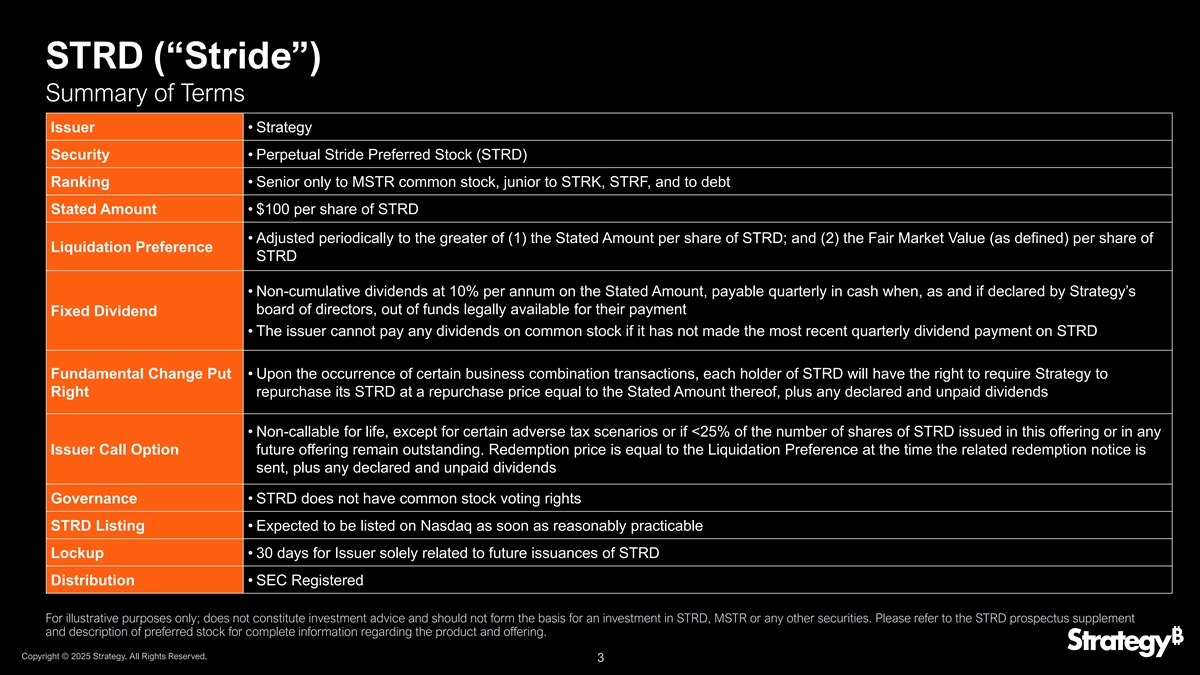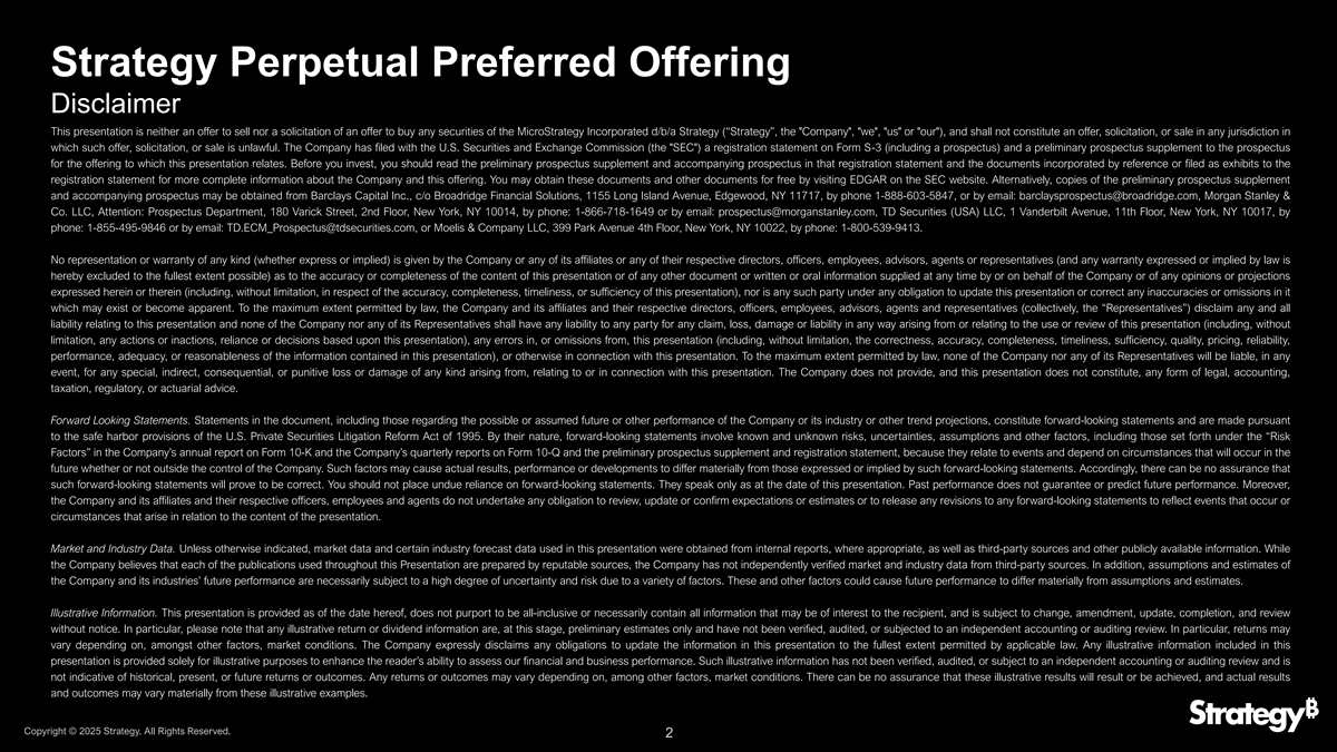 Strategy Perpetual Preferred Offering免责声明本演示文稿既不是出售要约,也不是购买MicroStrategy Incorporated d/b/a Strategy(“Strategy”、公司、我们、我们或我们的)任何证券的要约邀请,在此类要约、邀请或出售为非法的任何司法管辖区,均不构成要约、邀请或出售。公司已向美国证券交易委员会(SEC)提交了S-3表格的注册声明(包括招股说明书)以及与本演示文稿相关的招股说明书的初步招股说明书补充文件。在您投资之前,您应该阅读该注册声明中的初步招股说明书补充和随附的招股说明书以及通过引用并入或作为证物提交注册声明的文件,以获得有关公司和本次发行的更完整信息。您可以通过访问SEC网站上的EDGAR免费获得这些文件和其他文件。或者,可通过电话1-888-603-5847,或通过电子邮件:barclaysprospectus@broadridge.com,摩根士丹利 & Co. LLC,索取初步招股说明书补充文件及随附招股说明书的副本,请联系BARCLAYS CAPITAL INC.,c/o 布罗德里奇,1155 Long Island Avenue,Edgewood,NY 11717,或发送电子邮件:barclaysprospectus@broadridge.com,TERM2 & Co. LLC,收件人:Prospectus Department,180 Varick Street,2nd Floor,New York,NY 10014,电话:1-866-718-1649或发送电子邮件:prospectus@morganstanley.com,TD Securities(USA)LLC,1 Vanderbilt Avenue,11th Floor,New Yor公司或其任何关联公司或其各自的任何董事、高级职员、雇员、顾问、代理人或代表均不就本演示文稿的内容或由公司或代表公司在任何时间提供的任何其他文件或书面或口头信息或在此或其中表达的任何意见或预测的准确性或完整性(包括但不限于,关于本演示文稿的准确性、完整性、及时性或充分性),也不是任何此类方承担更新本演示文稿或更正其中可能存在或变得明显的任何不准确或遗漏的任何义务。在法律允许的最大范围内,公司及其关联公司及其各自的董事、高级职员、雇员、顾问、代理人和代表(统称“代表”)不承担与本演示文稿有关的任何和所有责任,公司或其任何代表均不对任何一方承担因使用或审查本演示文稿(包括但不限于任何作为或不作为、依赖或基于本演示文稿的决定)、本演示文稿中的任何错误或遗漏(包括但不限于,本演示文稿所载信息的正确性、准确性、完整性、及时性、充分性、质量、定价、可靠性、性能、充分性或合理性),或与本演示文稿相关的其他方面。在法律允许的最大范围内,无论如何,公司或其任何代表均不对因本演示文稿而引起、与之有关或与之相关的任何种类的任何特殊、间接、后果性或惩罚性损失或损害承担责任。公司不提供,且本演示文稿不构成任何形式的法律、会计、税务、监管或精算建议。前瞻性陈述。文件中的陈述,包括有关公司或其行业可能或假设的未来或其他业绩或其他趋势预测的陈述,构成前瞻性陈述,并根据1995年美国私人证券诉讼改革法案的安全港条款作出。就其性质而言,前瞻性陈述涉及已知和未知的风险、不确定性、假设和其他因素,包括公司年度报告表格10-K和公司季度报告表格10-Q和初步招股说明书补充和注册声明中“风险因素”项下所述的因素,因为它们与事件相关,并取决于未来将发生的情况,无论是否超出公司的控制范围。此类因素可能导致实际结果、业绩或发展与此类前瞻性陈述明示或暗示的内容存在重大差异。因此, 无法保证此类前瞻性陈述将被证明是正确的。你不应该过分依赖前瞻性陈述。他们仅在本次演讲之日发言。过往业绩不保证或预测未来业绩。此外,公司及其关联公司及其各自的高级职员、雇员和代理人不承担任何义务审查、更新或确认预期或估计,或发布对任何前瞻性陈述的任何修订,以反映与演示内容相关的发生的事件或出现的情况。市场和行业数据。除非另有说明,本演示文稿中使用的市场数据和某些行业预测数据均酌情从内部报告以及第三方来源和其他可公开获得的信息中获得。虽然公司认为本演示文稿中使用的每一份出版物均由有信誉的来源编写,但公司没有从第三方来源独立核实市场和行业数据。此外,对公司及所处行业未来业绩的假设和估计,由于多种因素的影响,必然存在较高的不确定性和风险性。这些因素和其他因素可能导致未来业绩与假设和估计存在重大差异。说明性信息。本演示文稿自本协议发布之日起提供,并不旨在包含所有内容或必然包含收件人可能感兴趣的所有信息,并且可能会进行更改、修改、更新、完成和审查,恕不另行通知。特别是,请注意,任何说明性回报或股息信息在现阶段仅为初步估计,未经核实、审计或独立会计或审计审查。特别是,回报可能会因市场状况等因素而有所不同。公司明确表示不承担在适用法律允许的最大范围内更新本演示文稿中信息的任何义务。本演示文稿中包含的任何说明性信息仅用于说明性目的,以增强读者评估我们的财务和业务绩效的能力。此类说明性信息未经核实、审计或接受独立会计或审计审查,不代表历史、当前或未来的回报或结果。除其他因素外,任何回报或结果都可能因市场状况而异。不能保证这些说明性结果会产生或实现,实际结果和结果可能与这些说明性例子大不相同。版权所有©2025年战略。版权所有。2