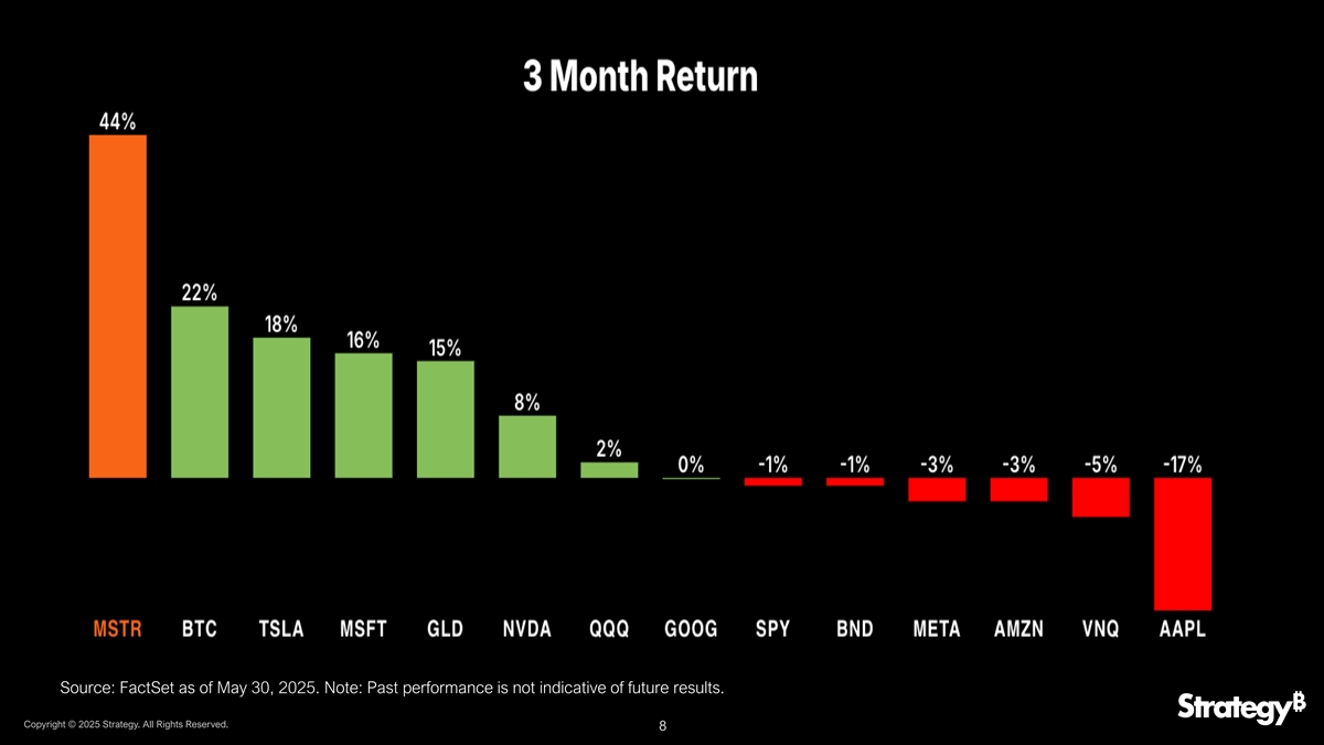 MSTR的表现优于所有主要资产和标普 500只股票2885%大型科技股关键资产和指数1110% 775% 266% 150% 146% 131% 121% 76% 78% 74% 62% 30% 17%-20 %(1)自Strategy采用比特币策略的2020年8月10日以来的资产表现。资料来源:FactSet,截至2025年5月30日。注:过往业绩不代表未来业绩。(1)债券指PIMCO活跃债券ETF(BOND)。版权所有©2025年战略。版权所有。7
