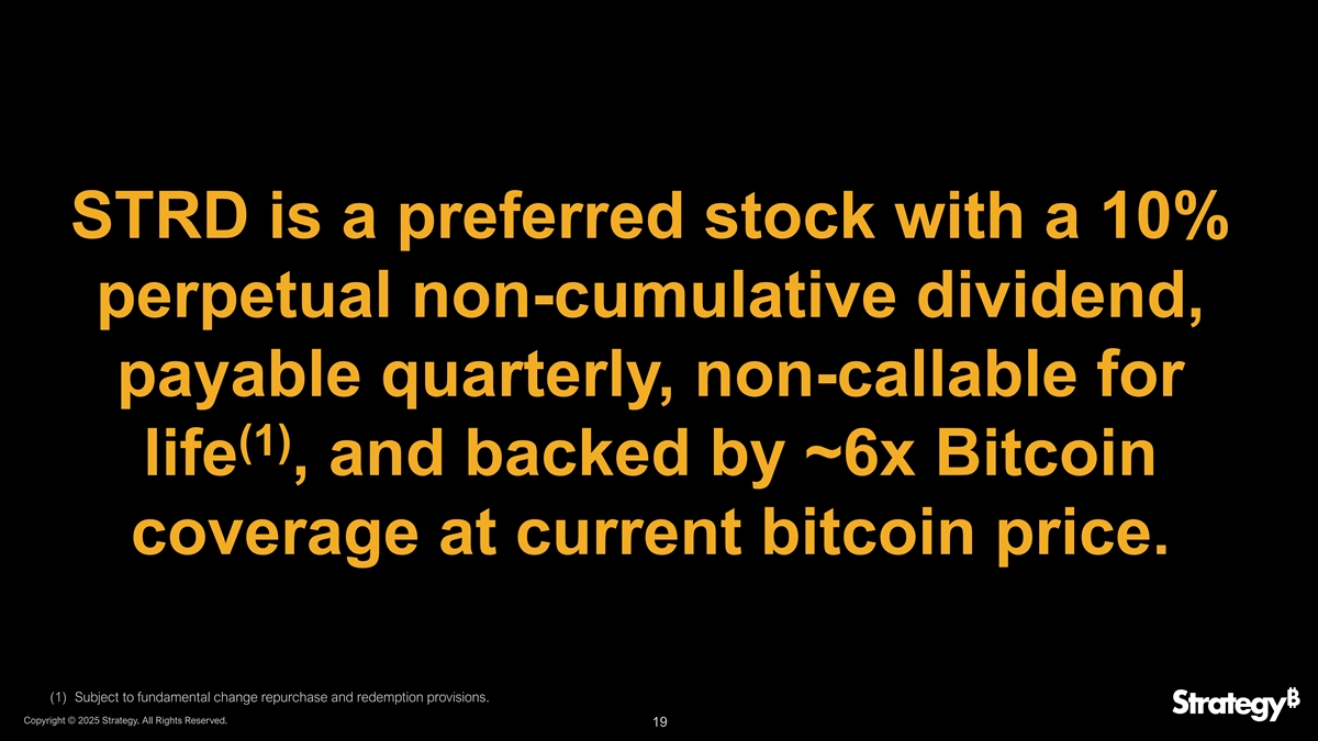 STRD是一种优先股,具有10%的永久非累积股息,每季度支付,(1)个存续期内不可赎回,以当前比特币价格支持约6倍的比特币覆盖率。(1)受制于基本面变化的回购和赎回条款。版权所有©2025年战略。版权所有。19
