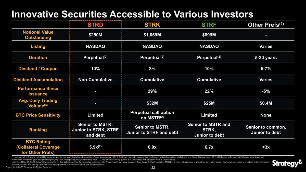 资历&波动我们的证券高STRF 10%固定股息,永续优先21亿美元ATM STRK 8%固定股息,可转换优先210亿美元ATM STRD 10%固定非累积股息,永续优先MSTR杠杆比特币敞口210亿美元ATM低波动高注:本幻灯片上提供的信息仅供说明之用。波动率基于STRF、STRK和MSTR的历史活动,并基于STRD的说明性波动率。实际结果可能与这些说明性结果大不相同。版权所有©2025年战略。版权所有。2121资历