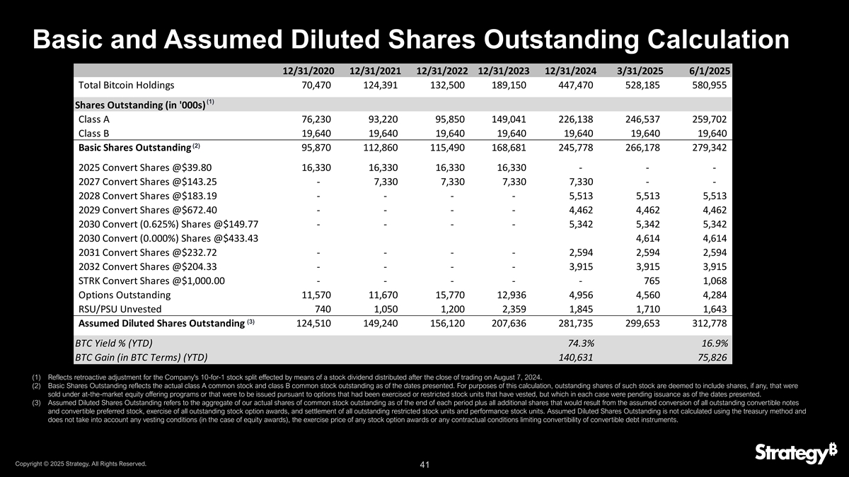 基本及假设已发行摊薄股份计算12/31/202012/31/202112/31/202212/31/202312/31/20243/31/20256/1/2025比特币总持有量70,470124,391132,500189,150447,470528,185580,955(1)已发行股份(' 000s)A类76,23093,22095,850149,041226,138246,537259,702 B类19,64019,64019,64019,64019,64019,64019,64019,640(2)已发行基本股份95,870112,860115,490168,681245,778266,178279,3422025转换股份@39.80美元16,3----4,4624,4624,4622030 Convert(0.625%)Shares @$ 149.77----5,3425,3425,3422030 Convert(0.000%)Shares @$ 433.434,6144,6142031 Convert Shares @$ 232.72----2,5942,5942,5942032 Convert Shares @$ 204.33----3,9153,9153,915 STRK Convert Shares @$ 1,000.00-----7651,068未行使期权11,57011,67015,77012,9364,9564,5604,284 RSU/PSU未归属7401,0501,2002,3591,8451,7BTC Gain(in BTC terms)(YTD)140,63175,826(1)反映了公司通过在2024年8月7日收盘后派发股票股息的方式进行的10比1股票分割的追溯调整。(2)已发行基本股份反映截至呈报日期实际已发行的A类普通股和B类普通股。就此计算而言,此类股票的流通股被视为包括根据市场上股票发行计划出售的或根据已被行使的期权或已归属的限制性股票单位将被发行的股票(如果有的话),但在每种情况下,截至所述日期,这些股票都在等待发行。(3)假定稀释已发行股份是指截至每期结束时我们的实际已发行普通股股份加上所有已发行可转换票据和可转换优先股的假定转换、所有已发行股票期权奖励的行使以及所有已发行限制性股票单位和业绩股票单位的结算所产生的所有额外股份的总和。假定稀释流通在外的股份不使用库藏法计算,也不考虑任何归属条件(在股权奖励的情况下)、任何股票期权奖励的行使价格或任何限制可转换债务工具可兑换性的合同条件。版权所有©2025年战略。版权所有。41