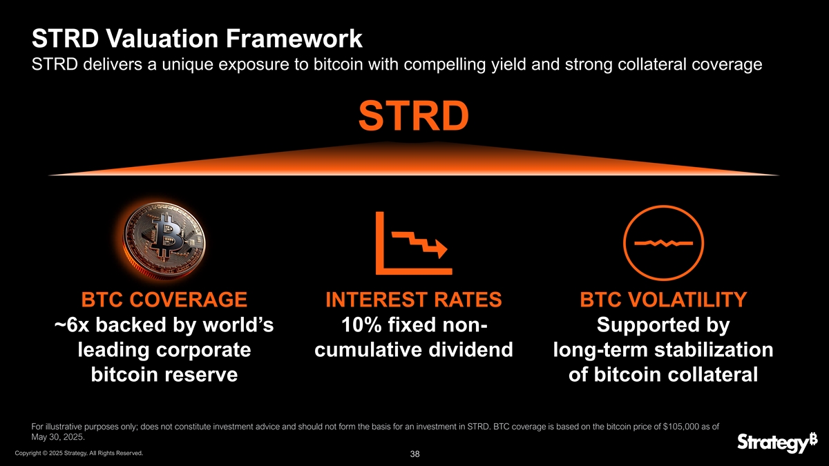 STRD估值框架STRD提供独特的比特币敞口,具有令人信服的收益率和强大的抵押品覆盖率STRD BTC覆盖利率BTC波动性~6倍,由全球10%的固定非支持的领先企业累积股息长期稳定比特币抵押品储备支持,仅用于说明目的;不构成投资建议,不应构成投资STRD的基础。BTC覆盖范围基于截至2025年5月30日的10.5万美元的比特币价格。版权所有©2025年战略。版权所有。38