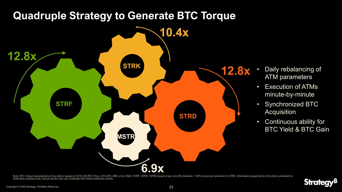 四重策略生成BTC扭矩10.4x 12.8x STRK •每日重新平衡12.8x ATM参数•每分钟执行ATM STRF •同步BTC采集STRD • BTC收益率的持续能力& BTC增益MSTR 6.9x注:本幻灯片所示的BTC扭矩基于105,000美元的BTC价格,30% BTC ARR,2.0x mNAV,STRF/STRK/STRD平价发行,STRK 8%股息/150%转换溢价。本幻灯片上提供的信息仅供说明之用。实际结果可能与这些说明性结果大不相同。版权所有©2025年战略。版权所有。23 23