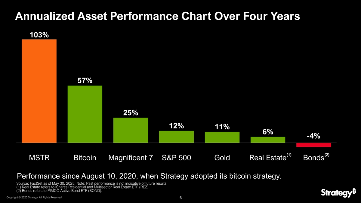四年多年化资产表现图103% 57% 25% 12% 11% 6%-4 %(1)(2)MSTR Bitcoin Magnificent 7 标普 500金地产债自2020年8月10日策略采用比特币策略以来的表现。资料来源:FactSet,截至2025年5月30日。注:过往业绩不代表未来业绩。(1)房地产指iShares住宅和多行业房地产ETF(REZ)(2)债券指PIMCO活跃债券ETF(BOND)。版权所有©2025年战略。版权所有。6
